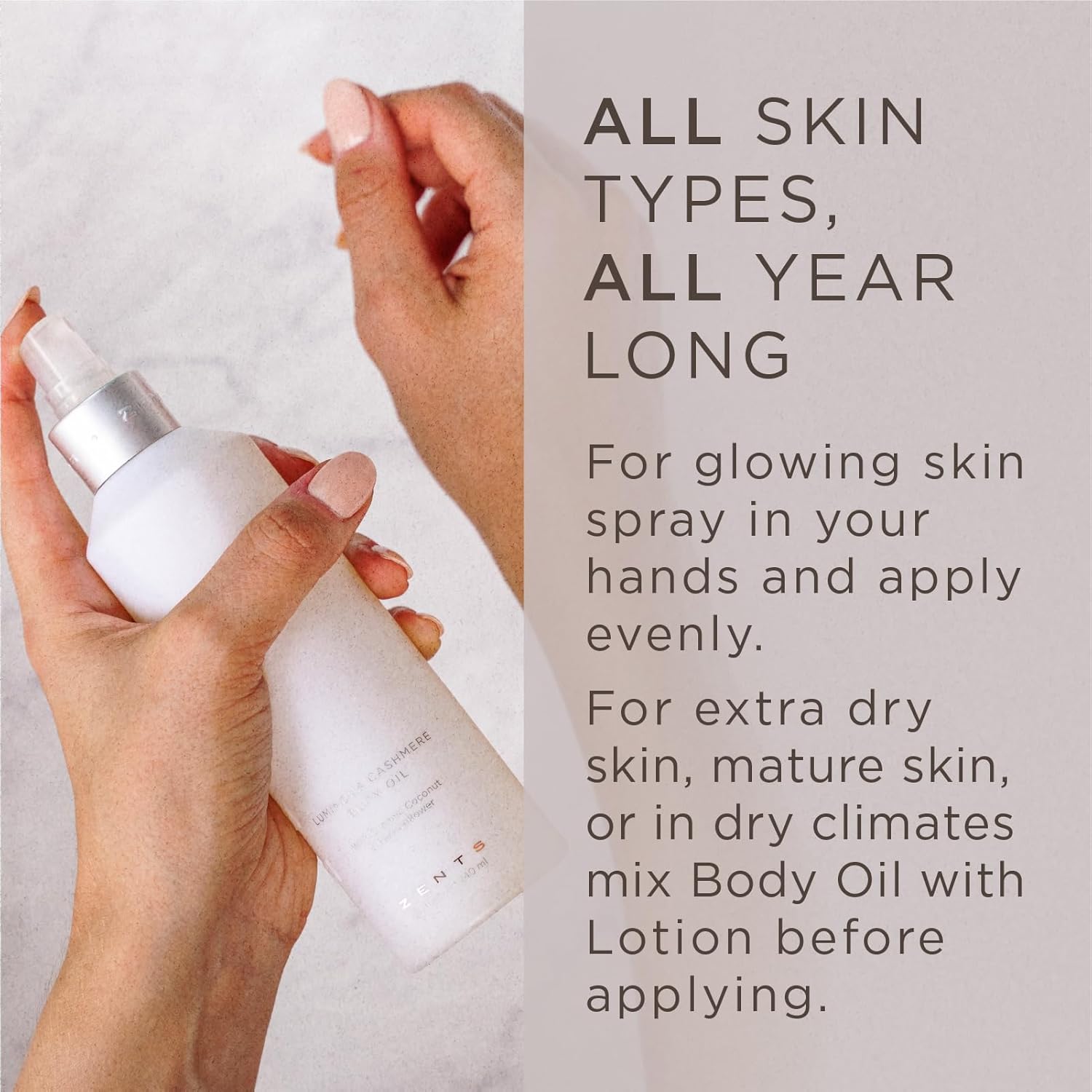 - ULTRA HYDRATING. Spritz onto the skin to help soften and moisturize while nourishing your skin with age-defying ingredients. This lightweight yet ultra-hydrating oil has a luxurious cashmere feel, perfect for after the shower or an afternoon in the sun.