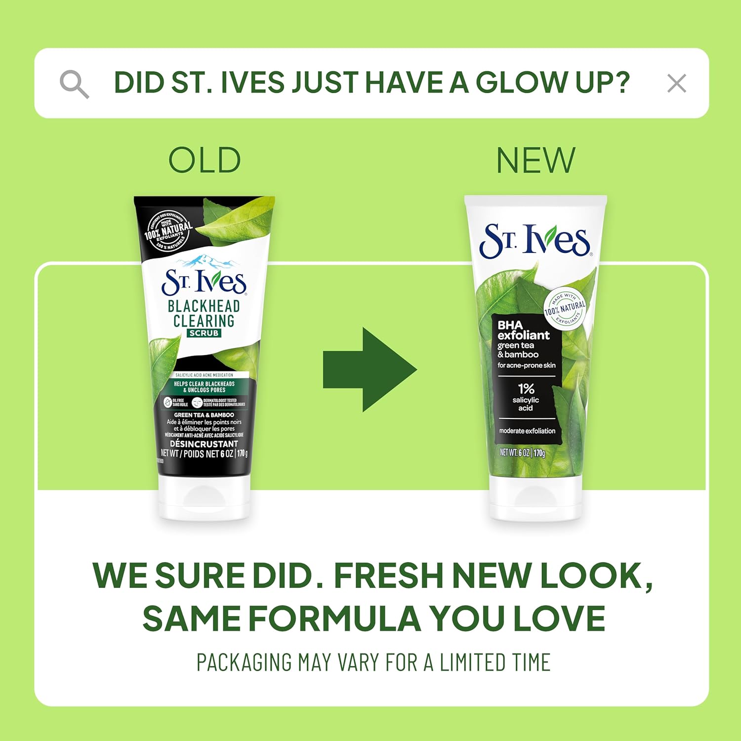 St. Ives Blackhead Clearing Face Scrub, Clears Blackheads & Unclogs Pores, Green Tea & Bamboo, Salicylic Acid Acne Treatment Facial Scrub, Moderate Exfoliator Skin Care with Natural Exfoliants 6 oz