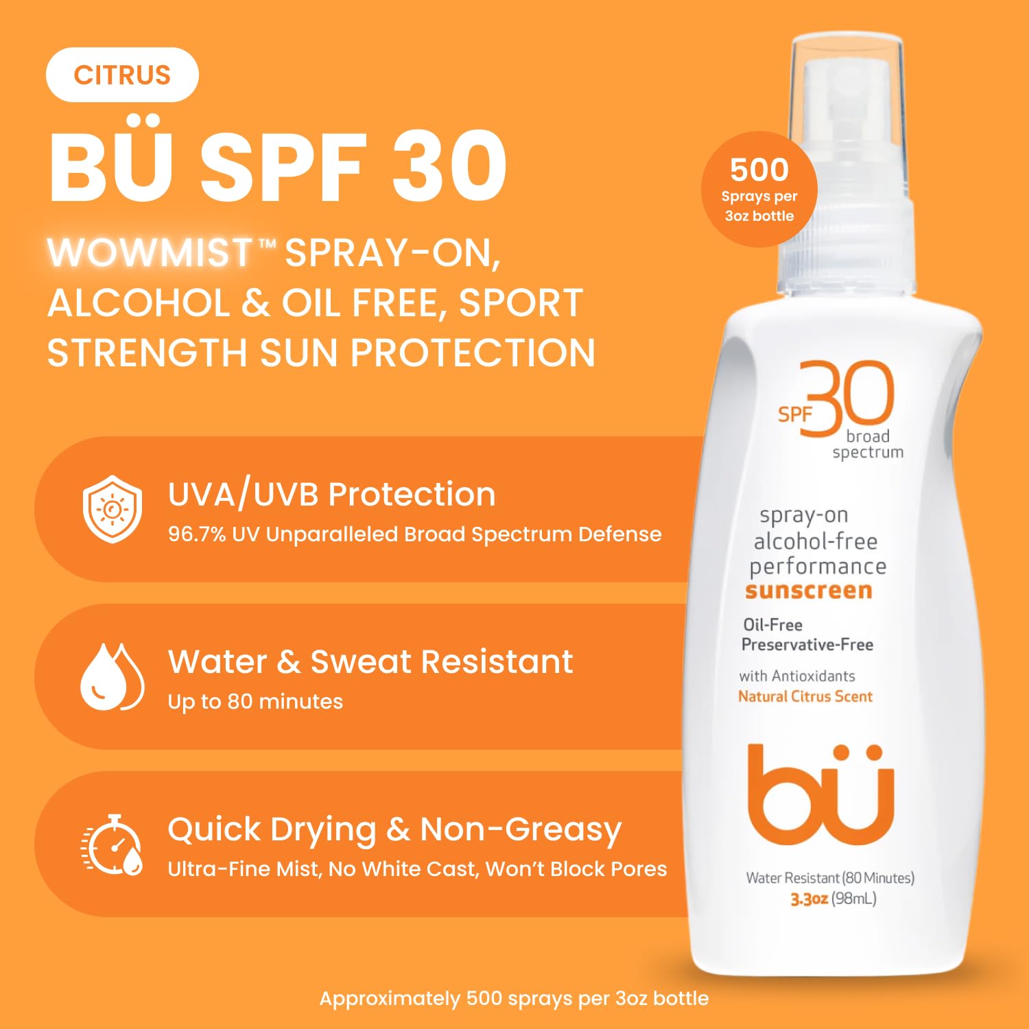 BU SPF 30 Sunscreen Spray for Face and Body, Non Aerosol Spray, Clear WOWmist, TSA Travel Size Sunblock, Oil Free and Water Resistant for Sensitive Skin, Natural Citrus 3.3 oz