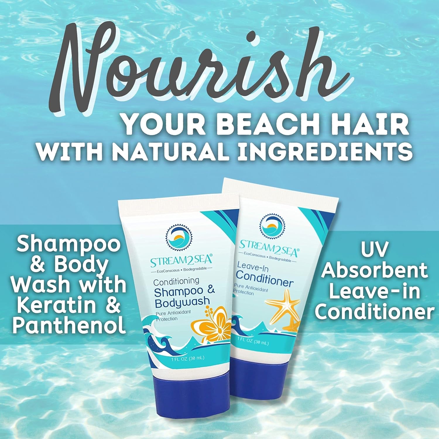 - Reef Safe, Biodegradable Travel Sized Gift Set; Our natural products are safe for use while camping and boating and is perfect for travel. Set Includes 1oz Travel Size Shampoo, Leave In Conditioner, SPF20 Sunscreen, SPF30 Tinted Mineral Sunscreen & Sting Relief Gel