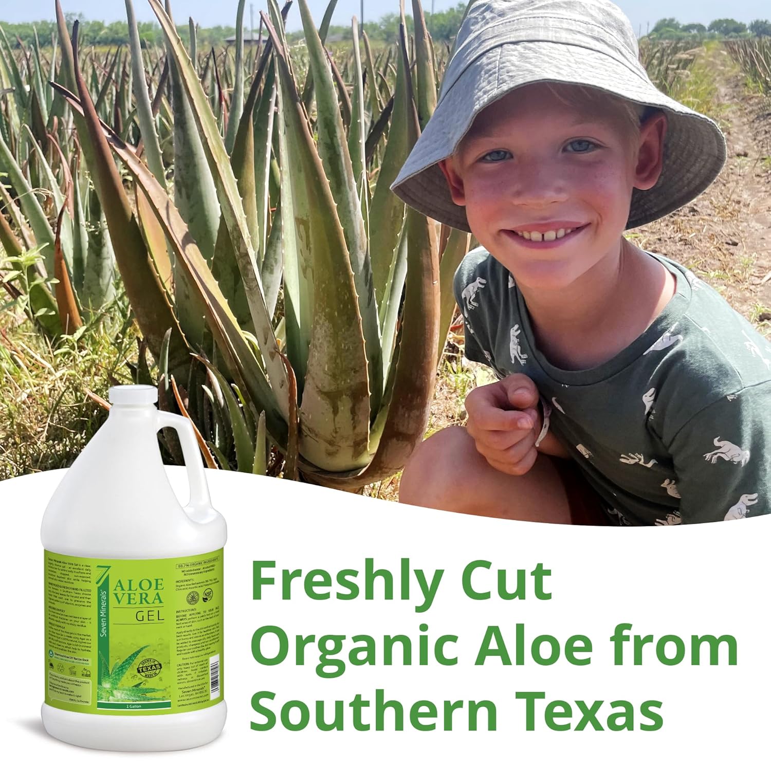 Seven Minerals Organic Aloe Vera Gel from freshly cut 100% Pure Aloe - 1 Gallon - HighestQuality, Texas grown, Vegan, Unscented - For Face, Skin, Hair, Sunburn Relief - Bulk DIY (128 Fl Oz)