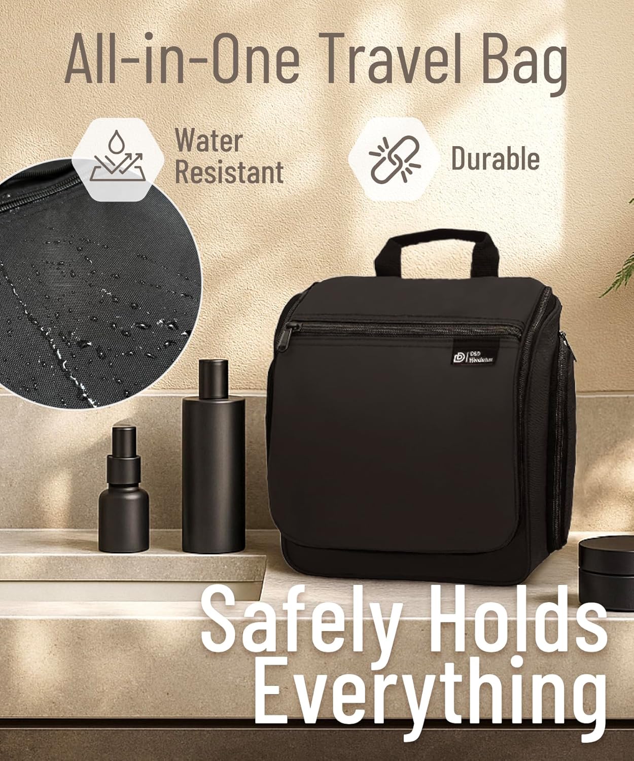 D&D Hanging Travel Toiletry Bag for Men and Women – Large Cosmetics, Makeup and Toiletries Organizer Kit with 10 Compartments, YKK Zippers, XXL Metal Swivel Hook, Water-Resistant Nylon
