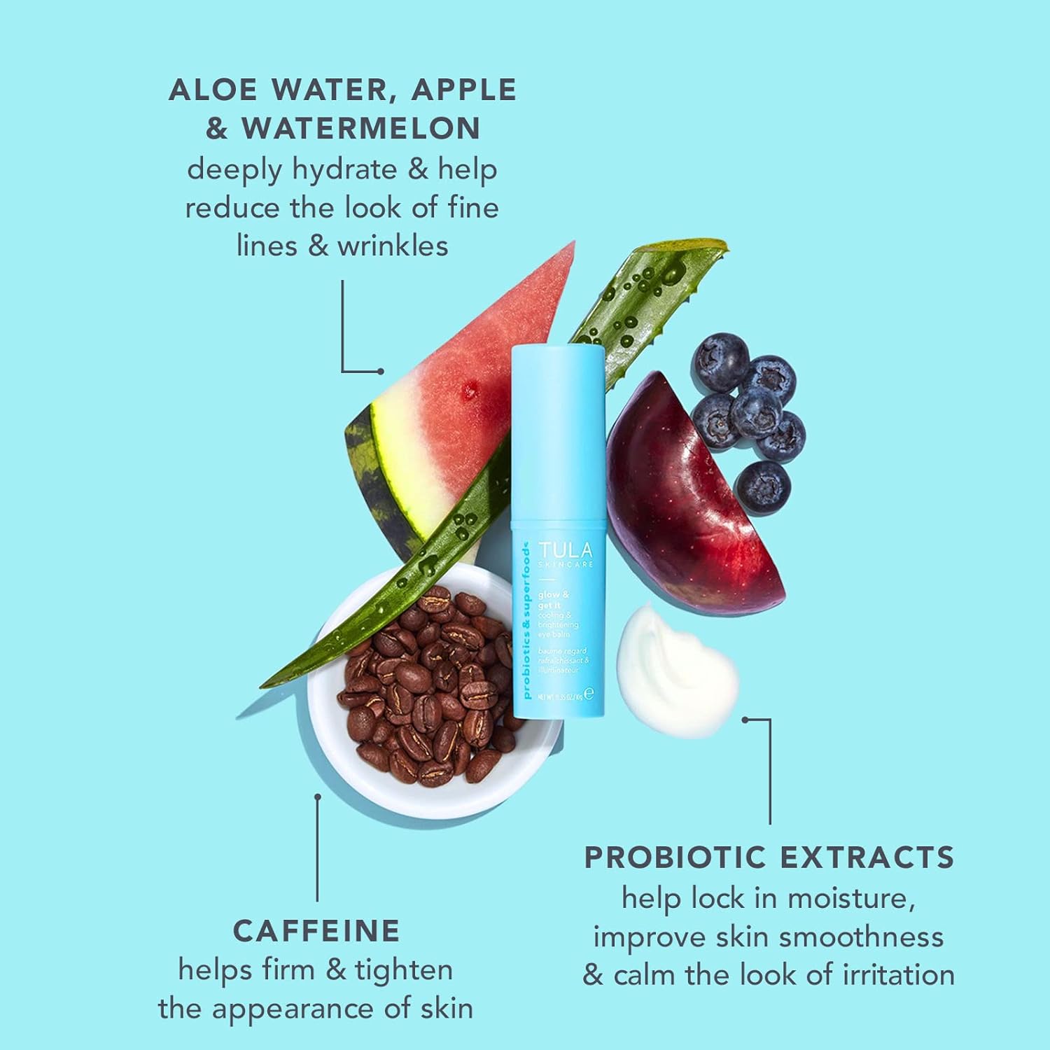 - BRIGHTENING EFFECT: Caffeine, apple & watermelon firm & can improve the look of eye puffiness any time of day!