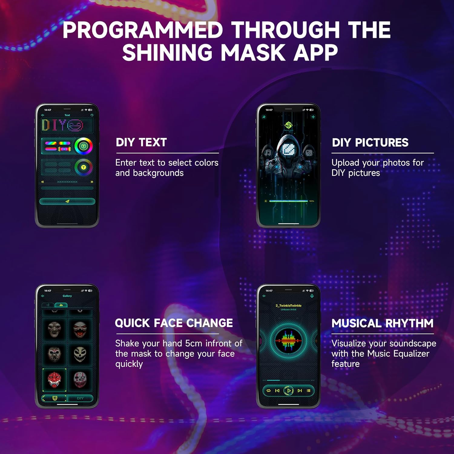 - Bluetooth Customization: Personalize your LED mask with 45 dynamic modes and 70 static images using the SHINING MASK app, perfect for creating unique cosplay mask designs.