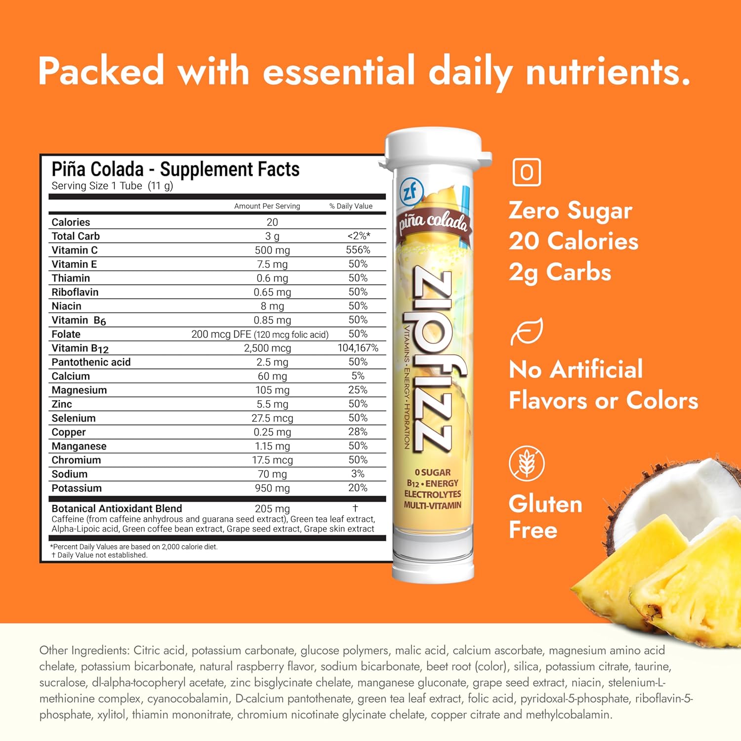 Zipfizz Daily Energy Drink Powder, Pina Colada, 20 Pack | 3-in-1 Sustained Energy, Rapid Hydration, and Essential Vitamins | Sugar-Free | Electrolyte Powder | Contains Vitamin B-12 & Antioxidants