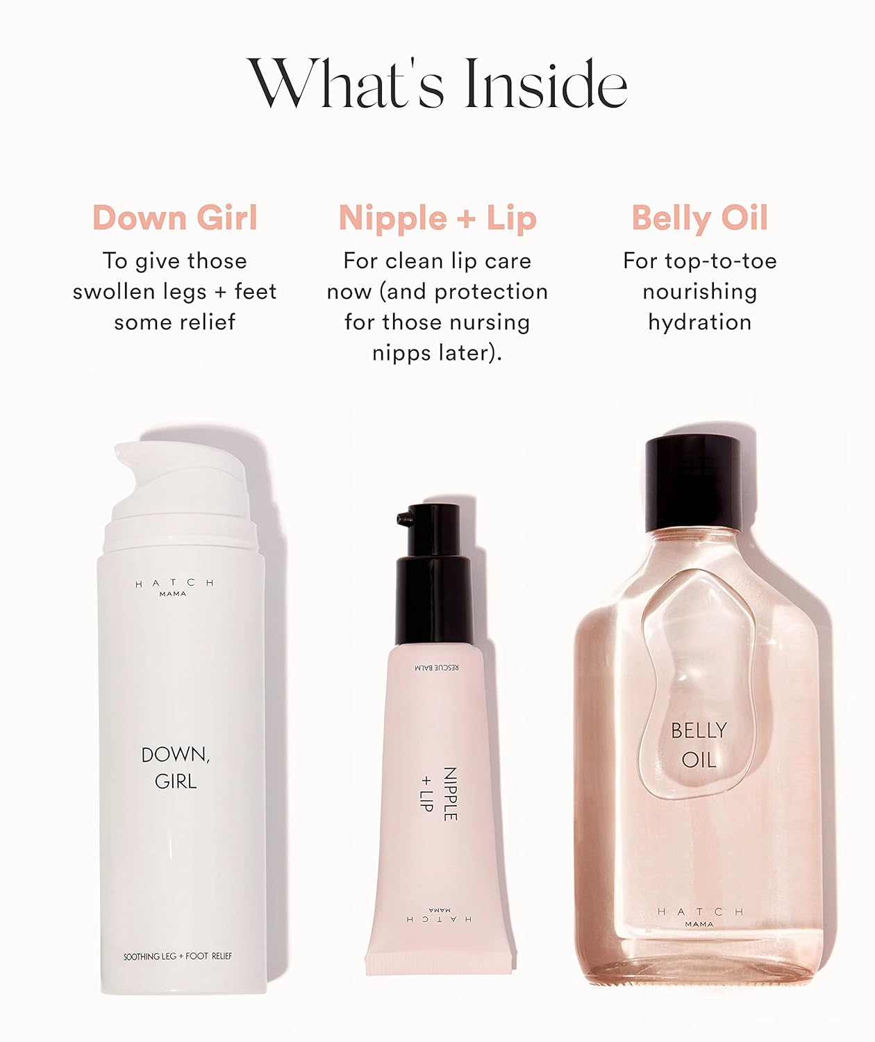 HATCH Mama Must Haves Kit - Belly Oil, Nipple + Lip Rescue Balm, and Down Girl Soothing Leg + Foot Relief - 3 Piece Set - Maternity Essentials