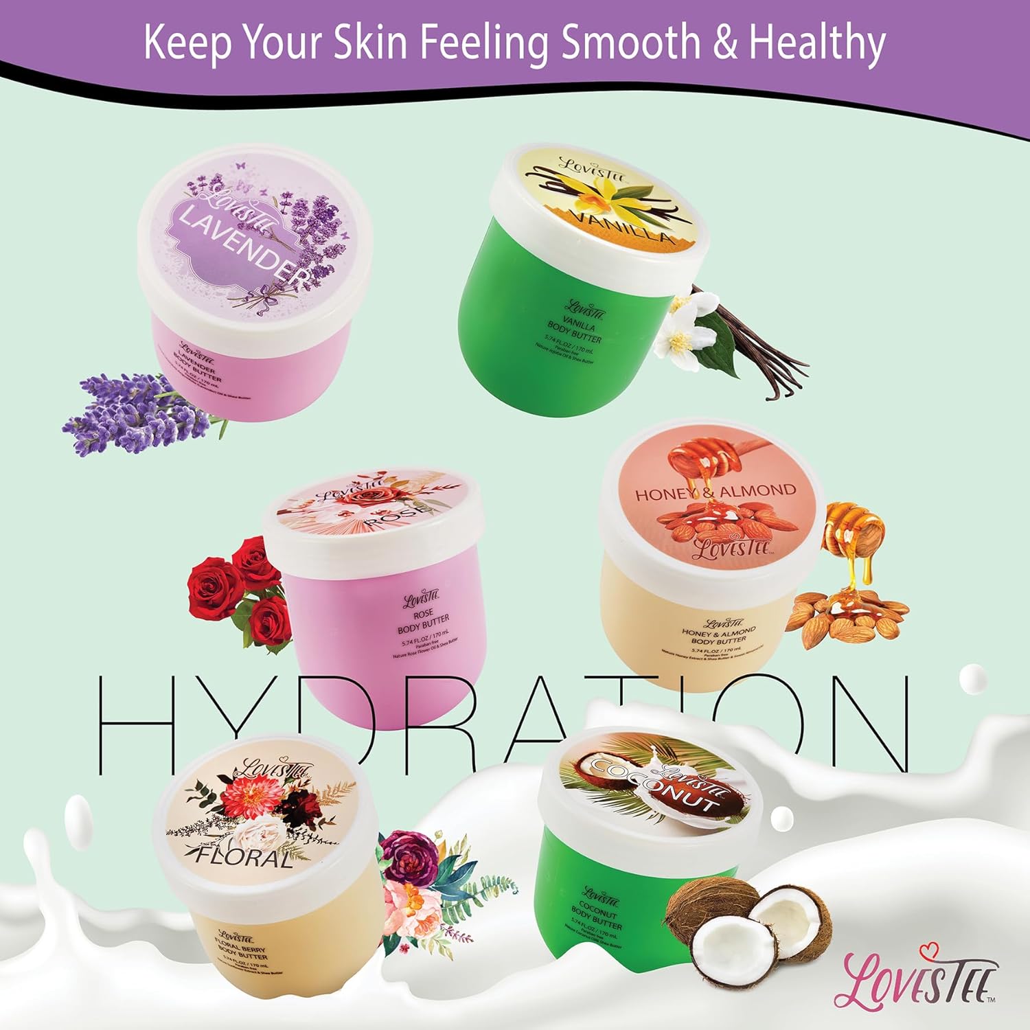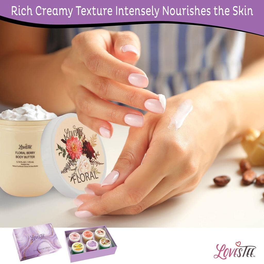 - Elegant Butter Body Lotion Gift: Includes a Variety of 6 Natural Butters, Lavender, Honey Almond, Vanilla, Rose and Coconut