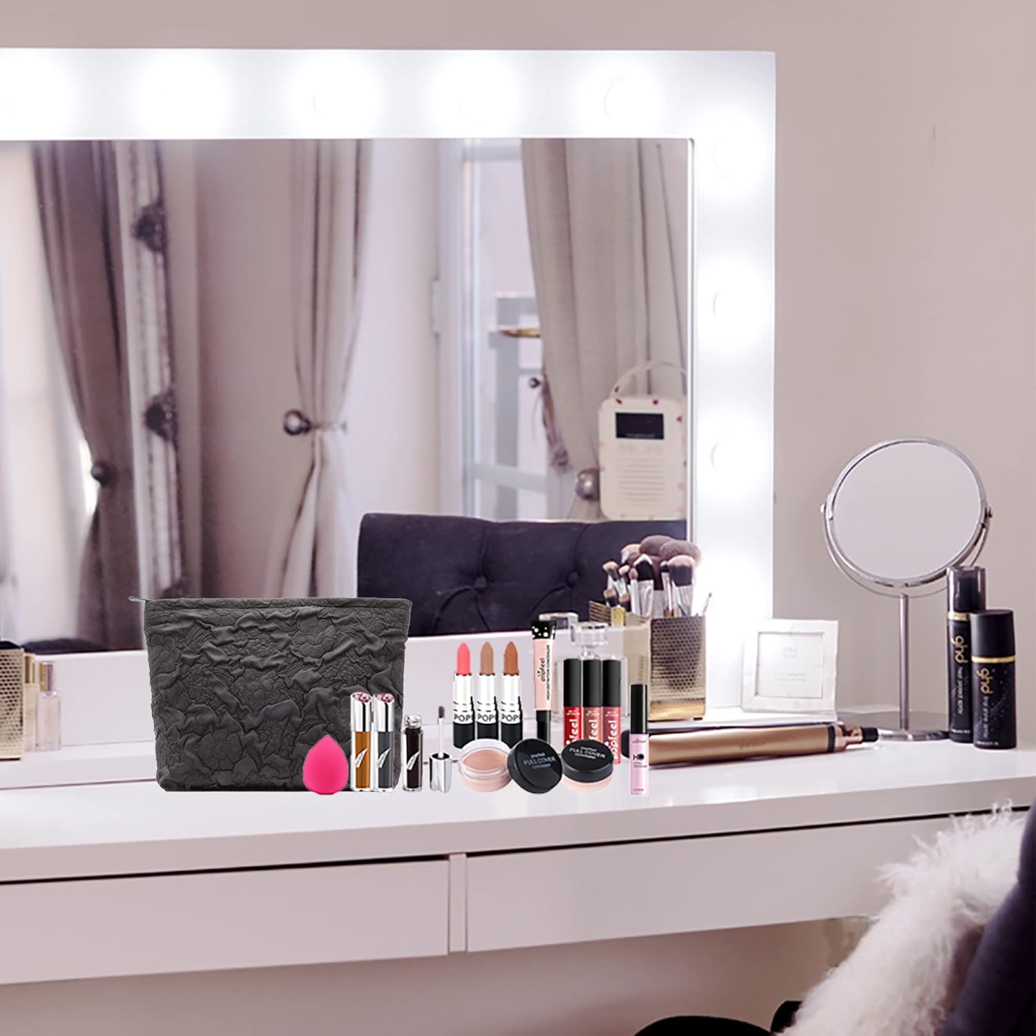 Makeup Bags for Purse Zipper Cosmetic Pouch Large Travel Canvas Make Up Organizer Tool Pouch for Women and Girls,Flower Black