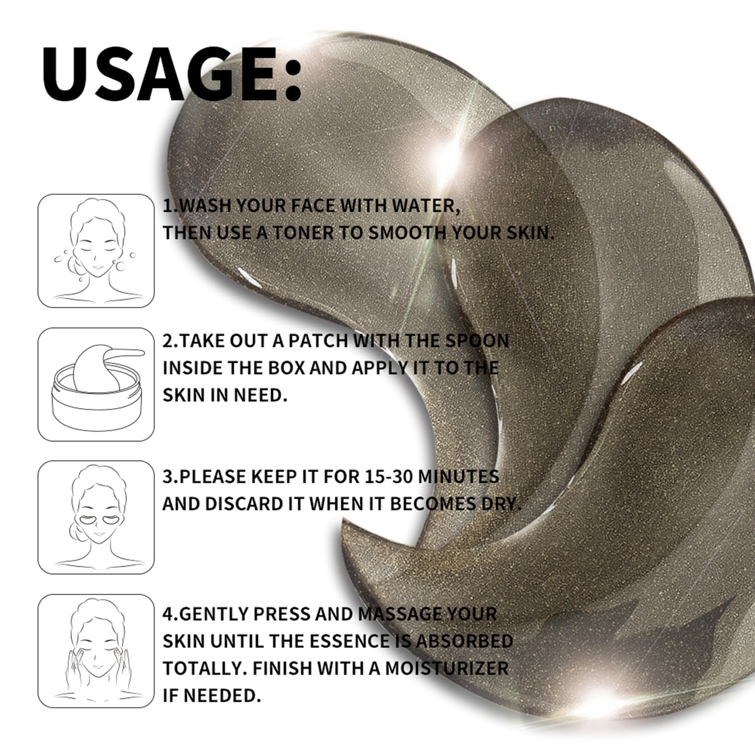 - [Usage Tips]-Wash your face with water before use, and don't apply eye cream or other skin care products on the part where the eye patch is used, otherwise, the eye patch is more likely to slip off during use. You can apply eye cream or other skin care products after use.