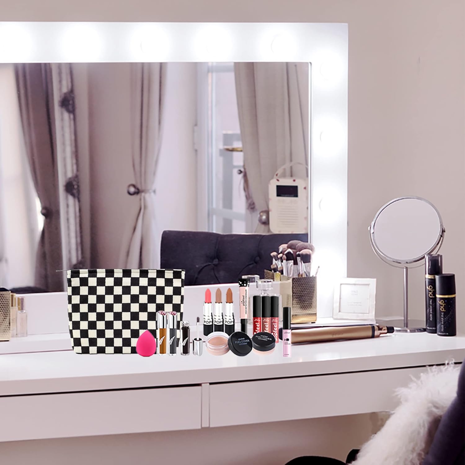 PAZIMIIK Makeup Bag Large Zipper Corduroy Make Up Pouch for Purse Travel Canvas Cosmetic Organizer for Women Brush Storage,Checkered Black