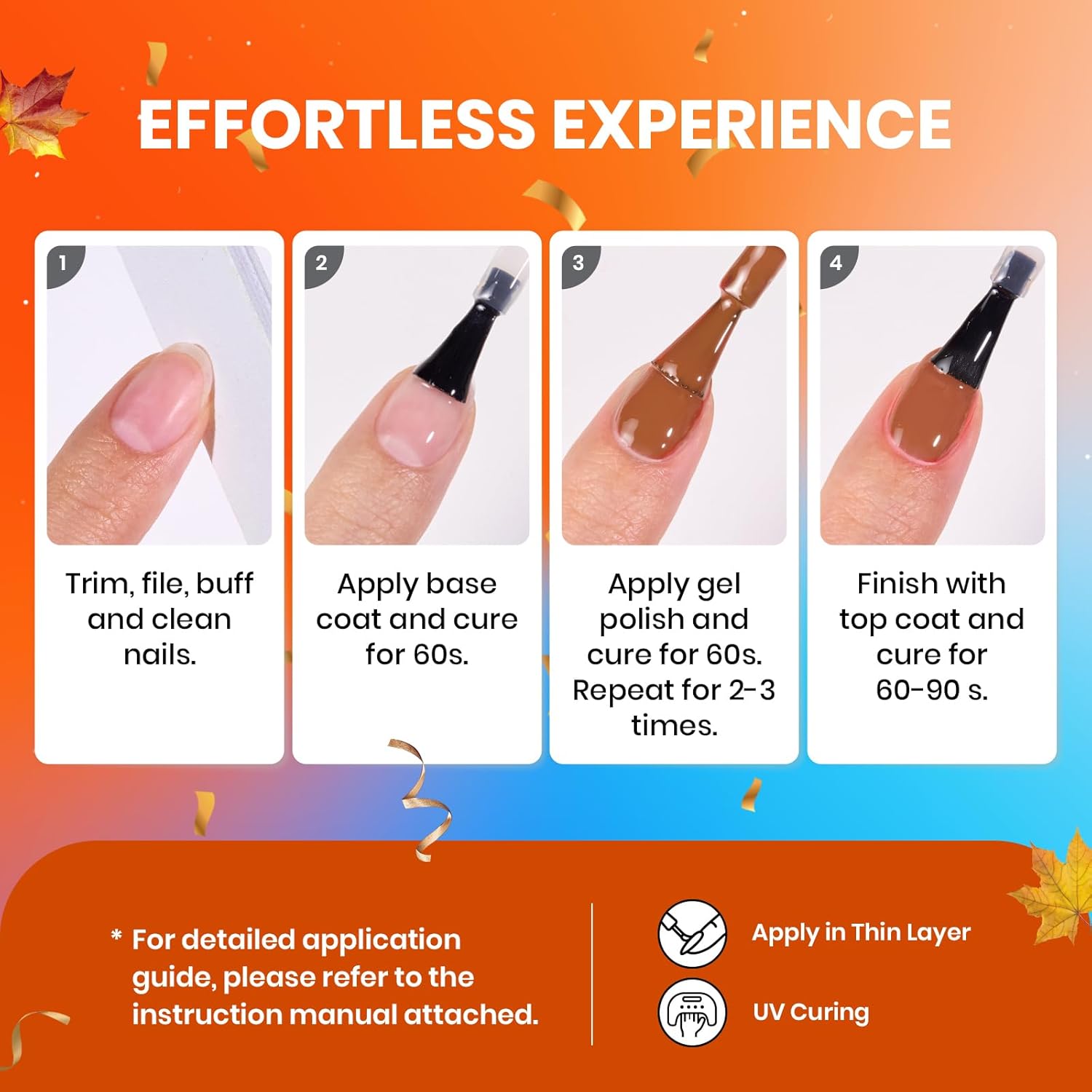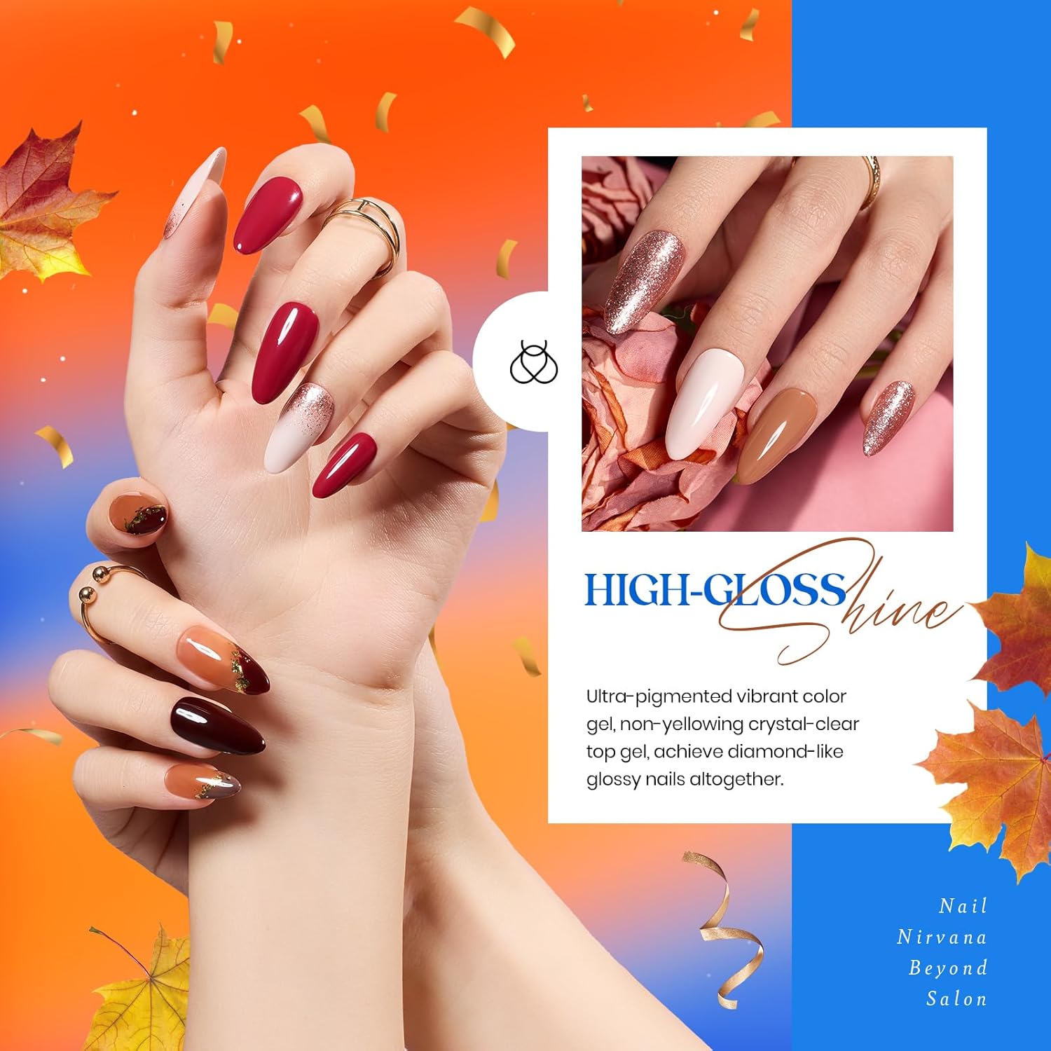- Fall Nail Fest : This Collection includes 20 beautiful shades of gel polish (0.17oz/5ml each bottle) and 3 glossy & matte top coats and base coats (0.25oz/7.5ml each bottle). The glossy and vibrant latte coffee colors are perfect for holidays and routine life. Color Numbers are: b816-b817-b818-b819-b820-b821-b822-b823-b824-b825-b826-b827-b828-b829-b830-b831-b832-b833-b834-b835.