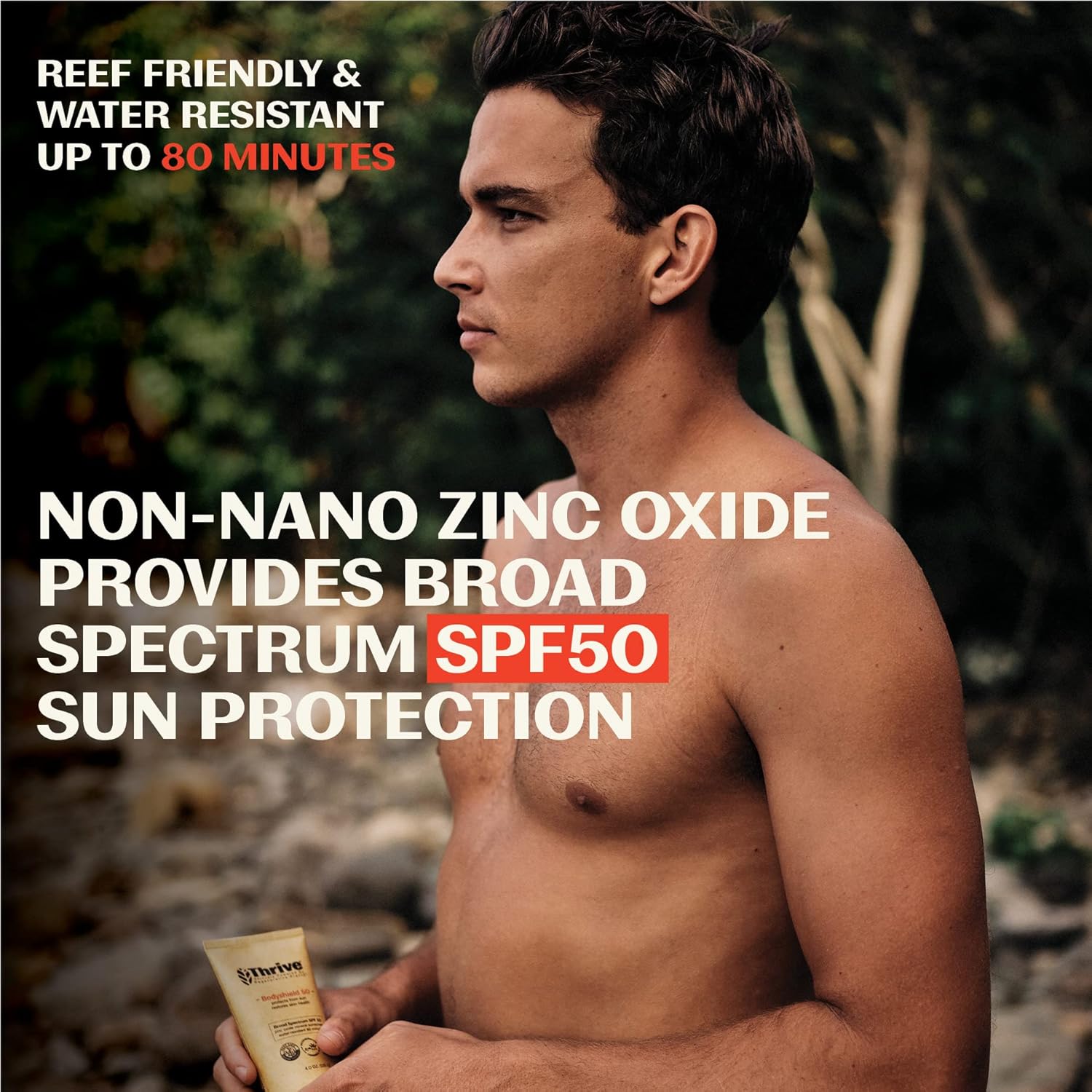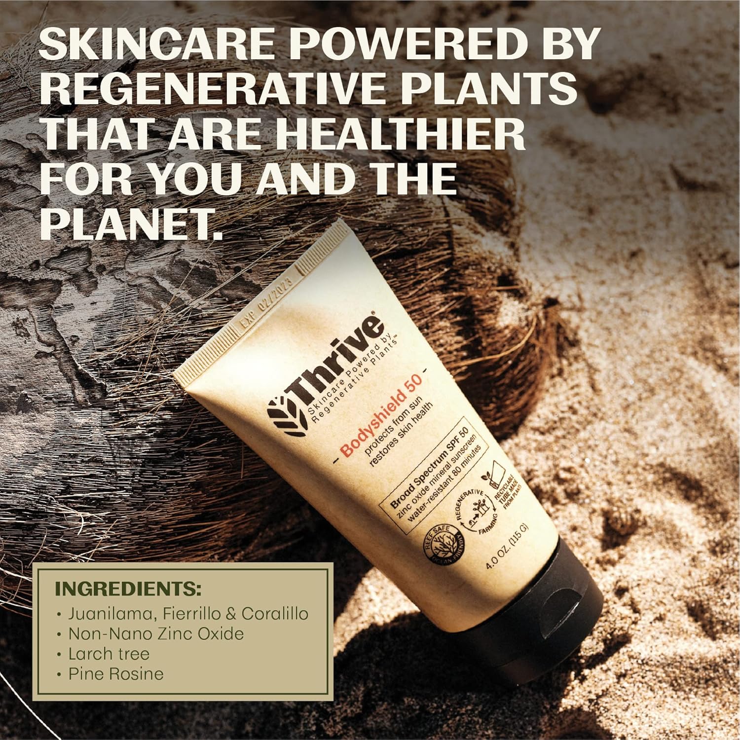 - NATURAL SPF PROTECTION - SPF 50 Sunscreen powered by Thrive’s antioxidant rich Costa Rican super-plants, Juanilama, Fierrillo & Coralillo, delivered in a tube made from recycled plastic, for a lighter environmental footprint. Our regenerative plant-derived formula helps reduce irritation and redness while repairing skin from sun exposure.