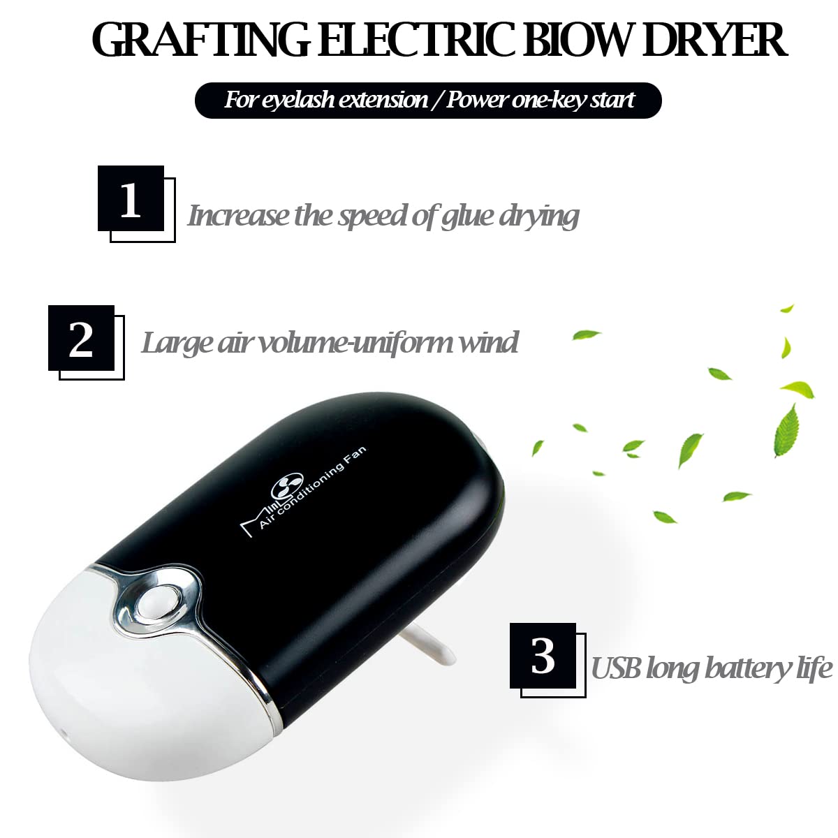- ăRechargeable Eyelash Fan DryerăThis USB rechargeable eyelash fan is designed without blades, safe and convenient,the built-in cooling system can blow out cold air to help the glue grafted eyelashes dry quickly.There is a T-shaped bracket on the back,which can stand on the table.Compact in size and light in weight,easy to carry and store,won't take up much space,you can carry it around you for travelling or business trips in your pocket or bag,and apply it anytime and anywhere.