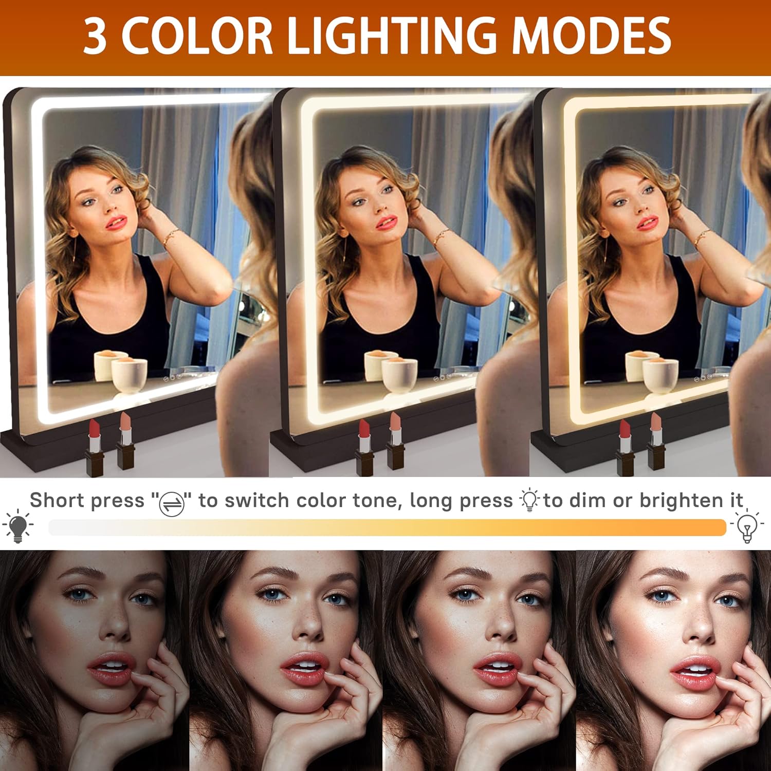 - đăSmart Touch Control & Memory FunctionăThis makeup mirror with lights has 3 smart touch buttons, turn on/off the light by touching the sensor switch, Press left button to change the color modes, long press right button to adjust the led brightness. This lighted makeup mirror is specially designed memory functionfunction keep your lights setting like your last use.