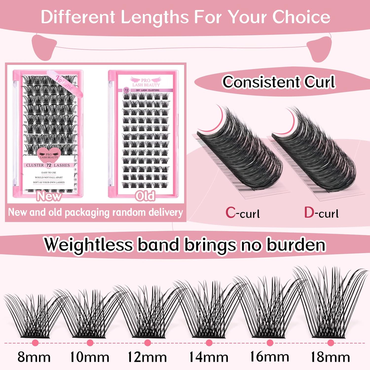 - 72 Pcs Cluster Lashes: The Cluster lashes are avaiable now! Different from other brands, PRO LashBeauty can provide 72 pcs in one tray! Mix Length from 8mm to 16mm. You can get more lashes and use more times.