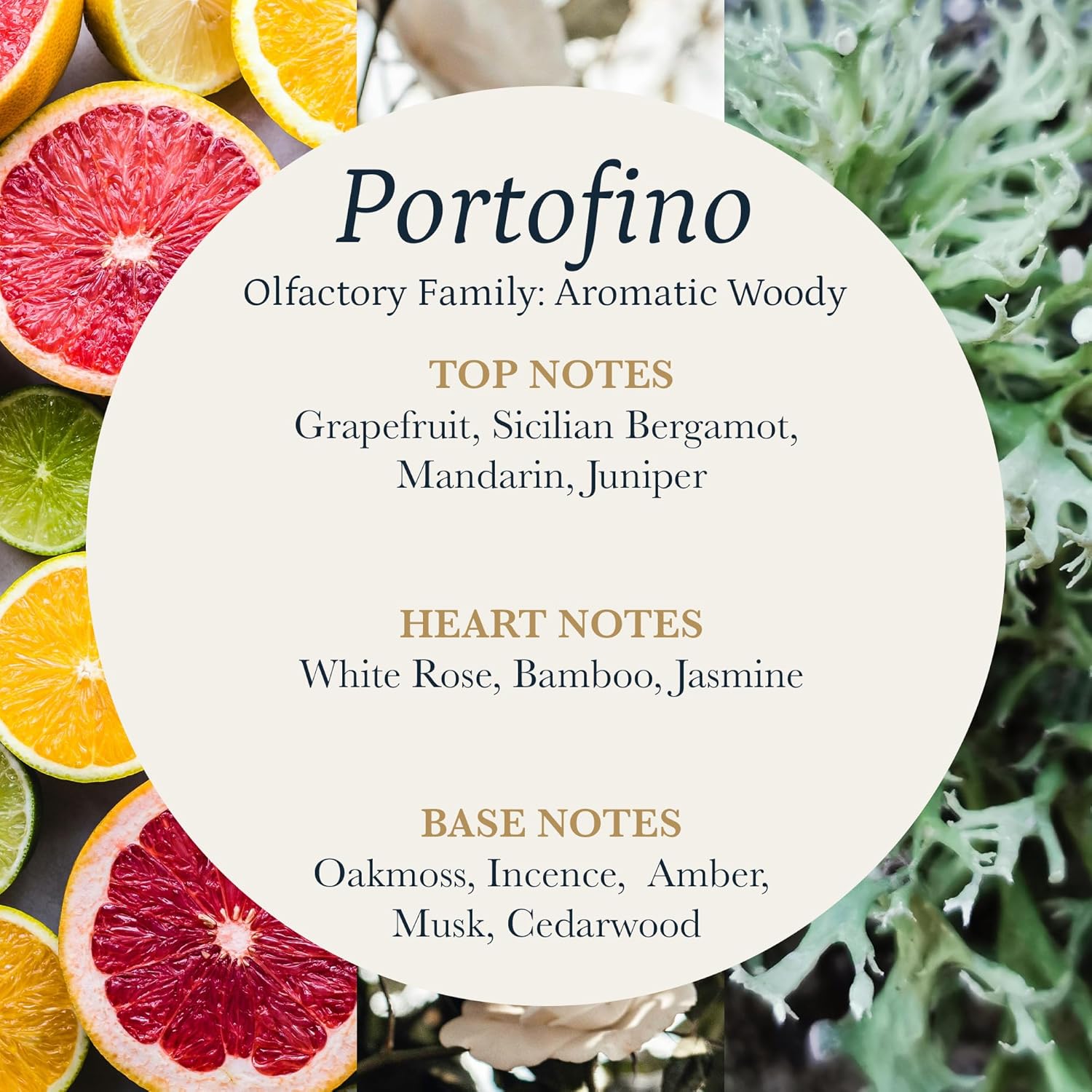 - <strong>Authentic Portofino Scent</strong> A sophisticated fragrance oil blending grapefruit, bergamot, Sicilian mandarin, orange, and juniper with warm notes of rosemary, rosewood, musk, incense and oakmoss.