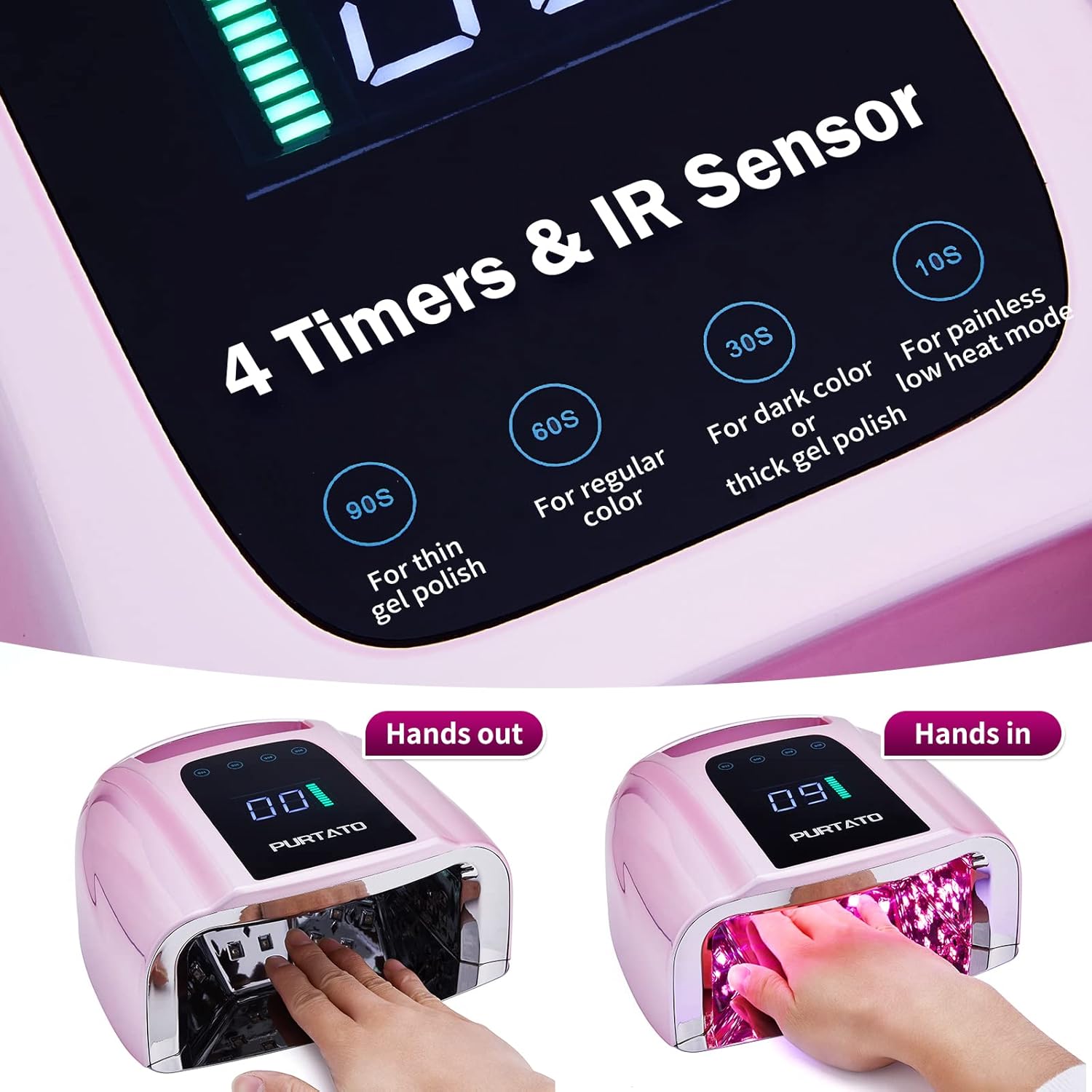 - 【4 TIMERS & INFRARED SENSOR】- PURTATO nail Lamp provides 10S / 30S / 60S / 90S flexible drying options and the time will be displayed on the large LCD screen. Your manicure & pedicure will be more fun and energy efficient with smart sensor. Hands/feet in, lamp on. Hands/feet out,lamp off. Heat dissipation hole avoid overheat.Very smart, portable, fast, quiet for using.