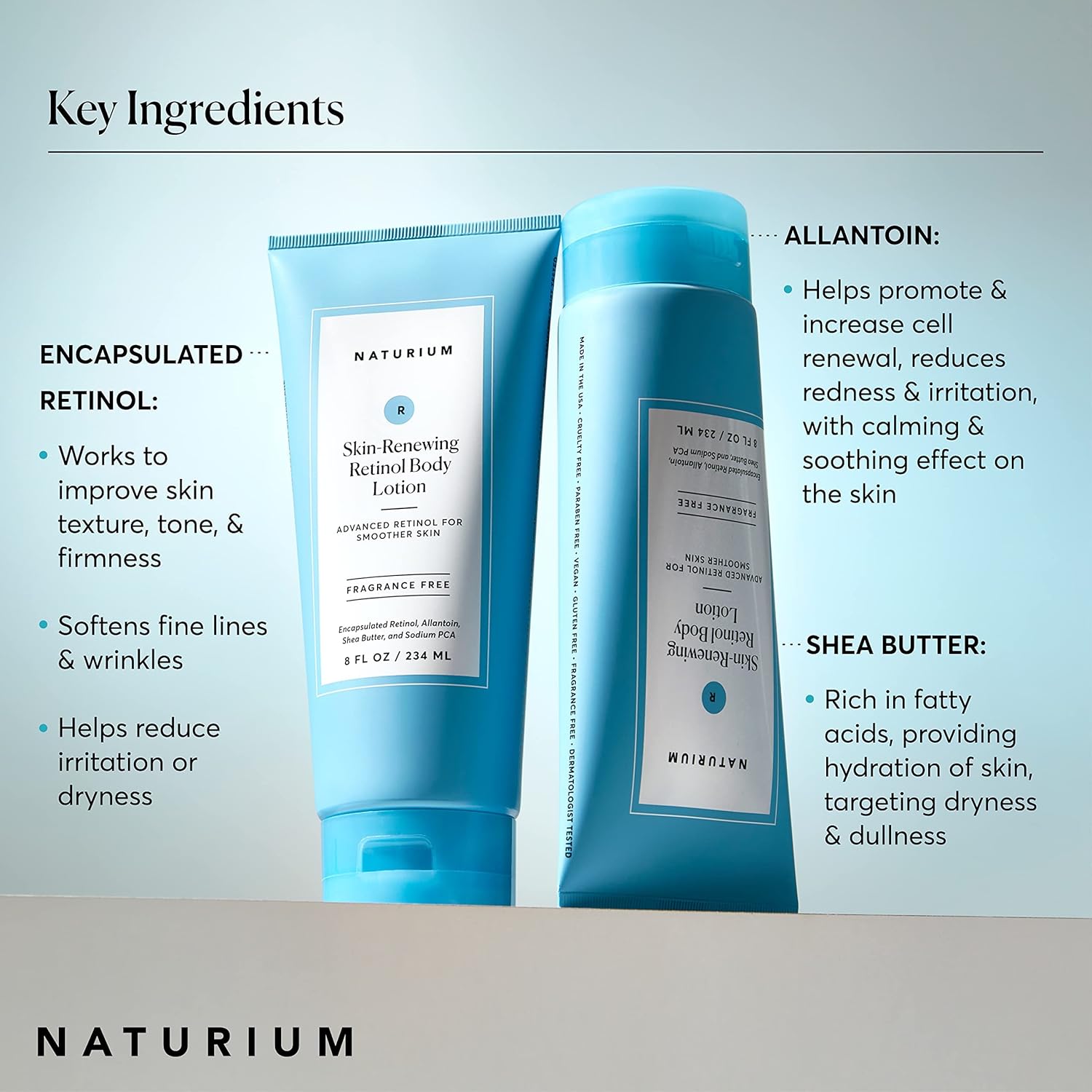 - ANTI-AGING BODY CARE: A nourishing body lotion that moisturizes and renews. Our Retinol Body Lotion promotes skin renewal, working to improve skin texture, tone, and firmness. This lotion leaves skin feeling soft, supple, and nourished