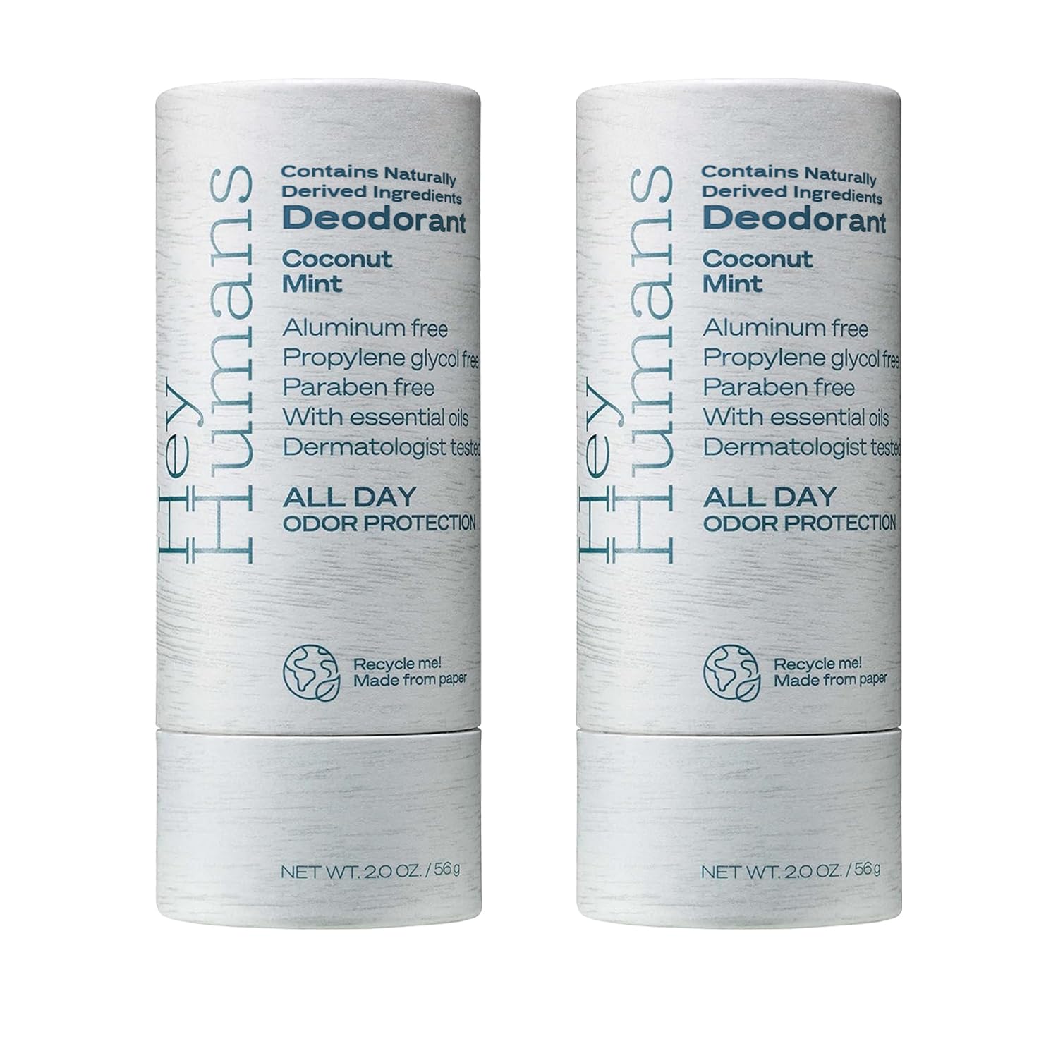 - Hey Humans deodorants are aluminum-free, paraben-free, phthalate-free, propylene glycol-free & silicone-free. They're also packaged in easily recyclabe paper for sustainability.
