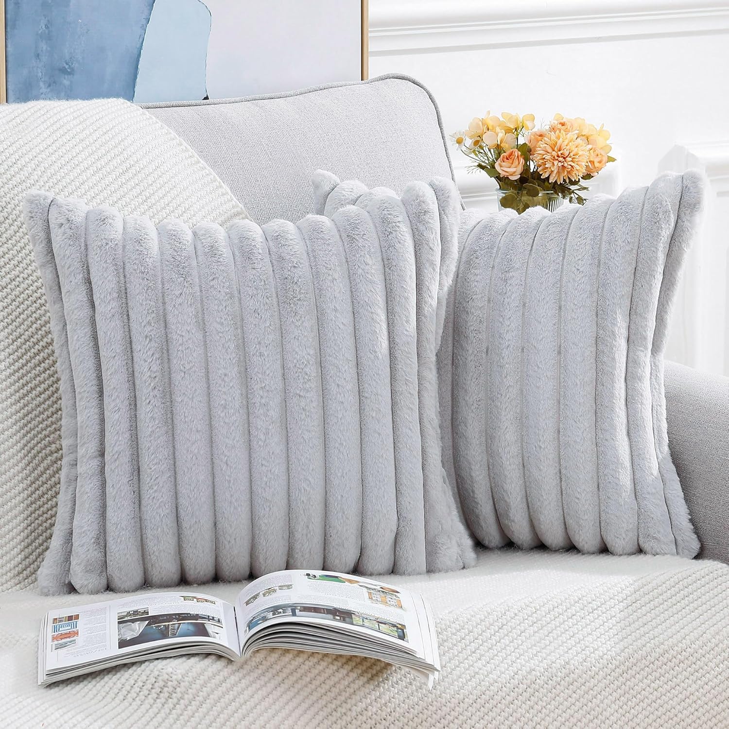 MADIZZ Set of 2 Faux Wool Plush Decorative Throw Pillow Covers 22x22 Inch Light Grey Fluffy Striped Soft Decorative Cushion Cover for Sofa Bedroom Pillow Shell