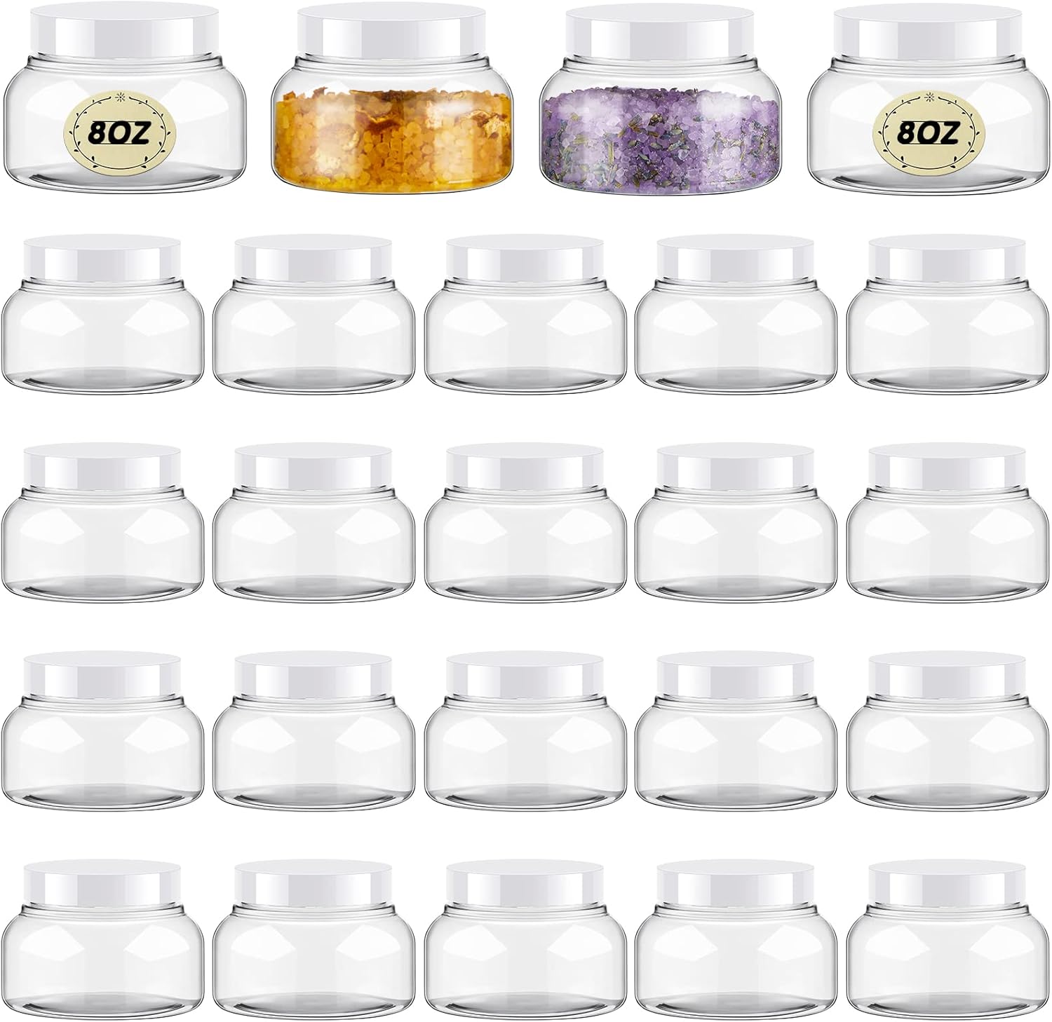 Tessco 24 Pack Plastic Jars with Lids Labels Empty Clear Plastic Jars Round Refillable Cosmetic Containers Body Butter Containers Bulk Sugar Scrub Bottle for Make Up(8 oz,White)