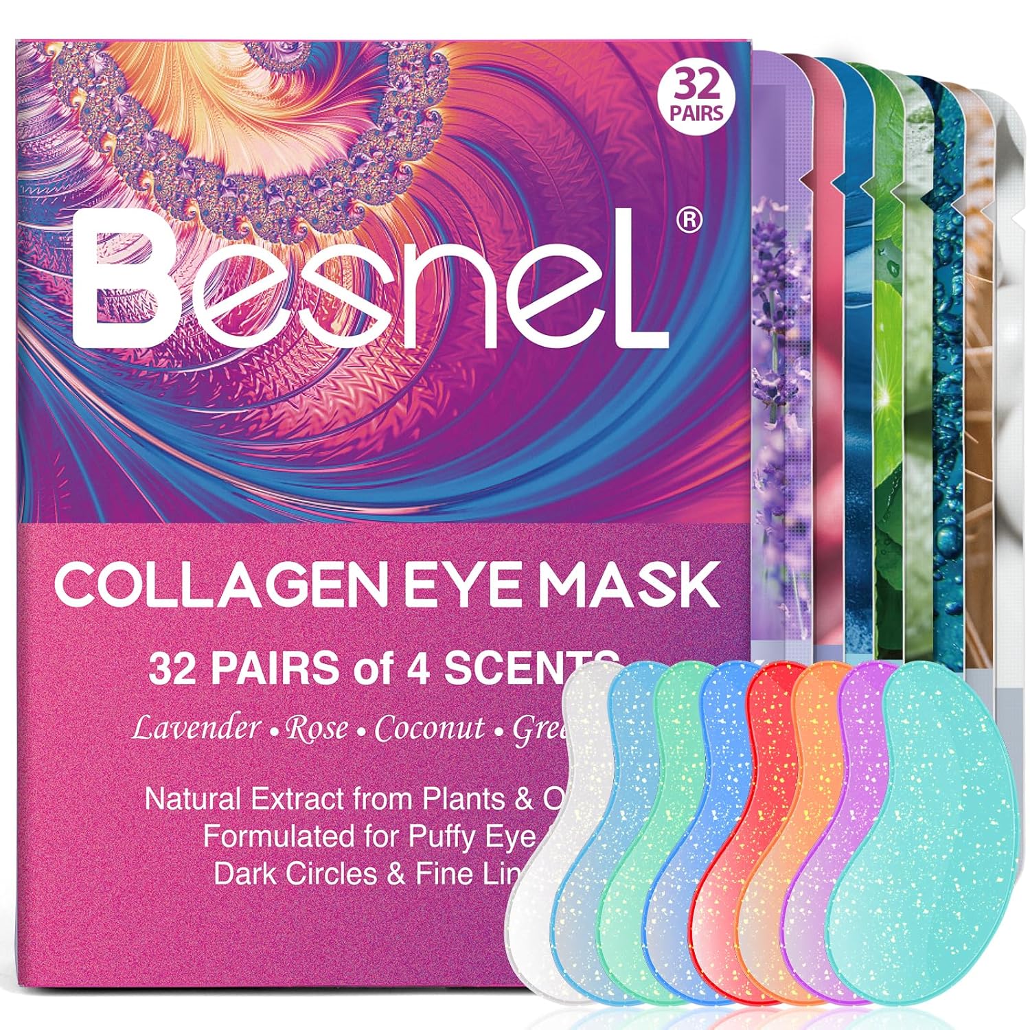 - 【Natural and Effctive】BESNEL 32 pairs eye masks with all kinds of natural ingredients such as wheat hydrolyzed collagen, sodium hyaluronate, centella asiatica extract, camellia extract, pearl extrac, anti-wrinkle ingredients and so on,they are very effective for dark circles, puffy eyes, eye bags.