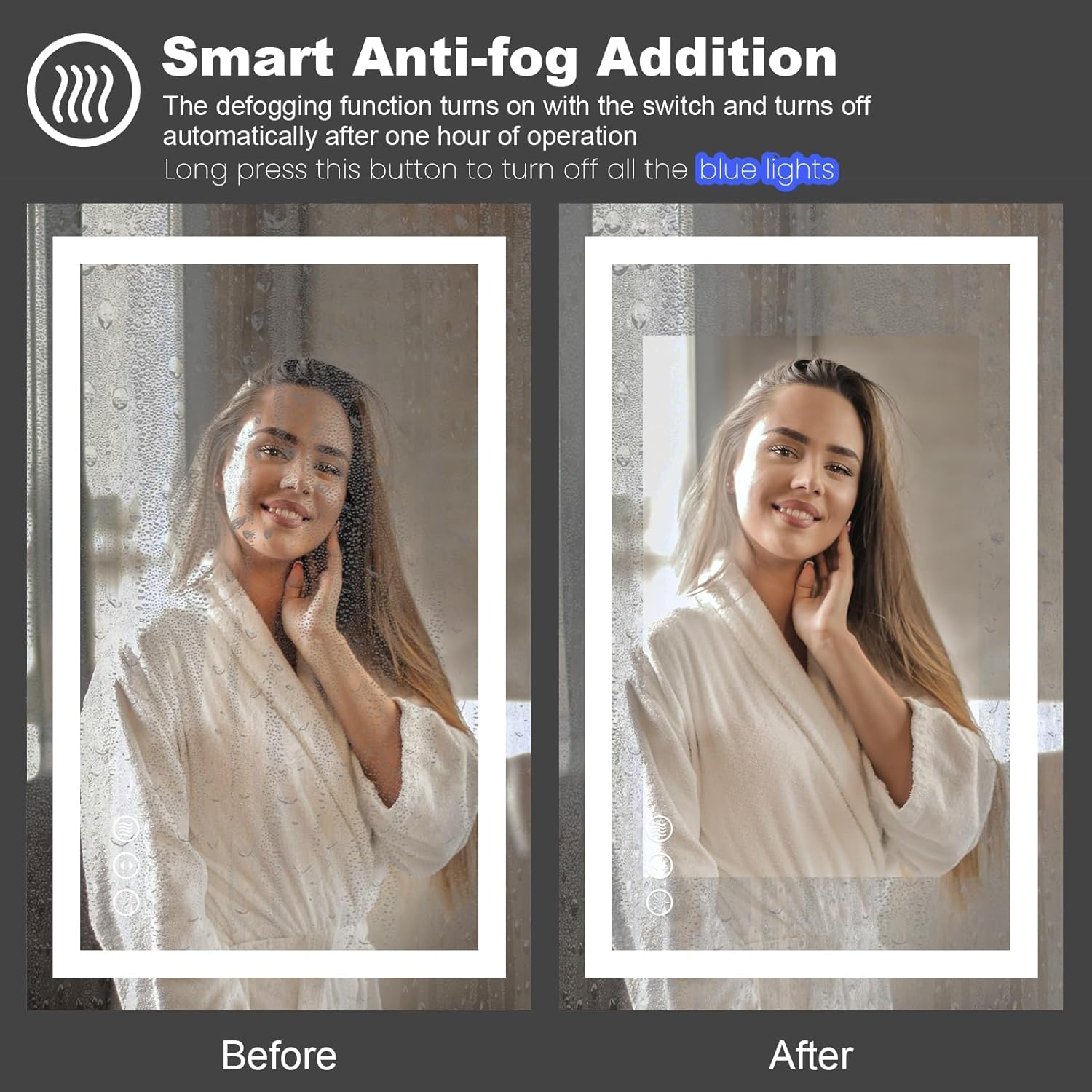 - [Anti-fog]: After a few minutes of opening the defogger, the heater in the mirror will disperse the fog from the center to sides, the mirror will still reflect clearly in the bathroom surrounded by hot air; It will turn on with the power on and automatically turns off after 1 hour