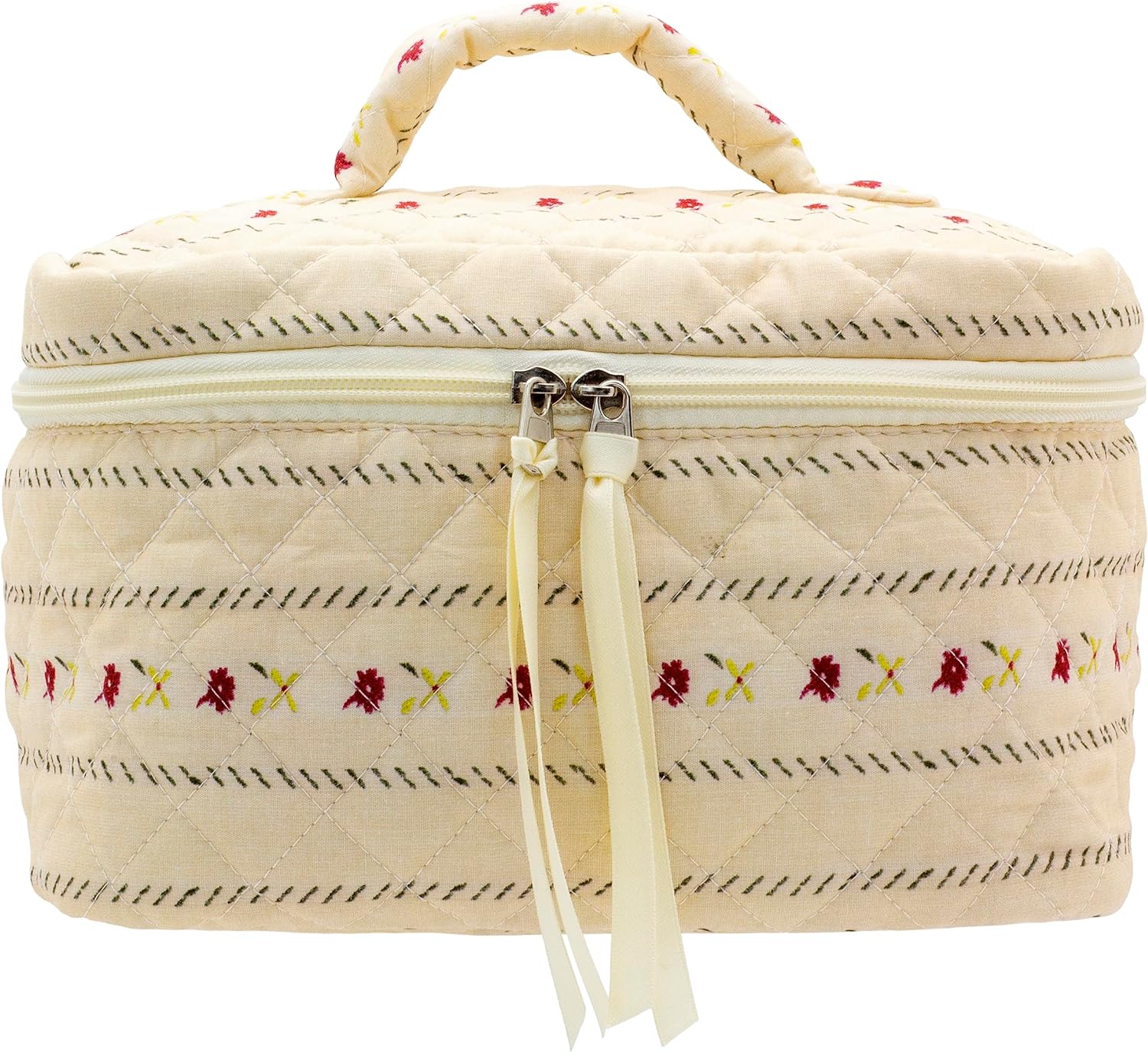PAZIMIIK Quilted Makeup Bag Large Travel Zipper Soft Cosmetic Case for Women Girls Make Up,Little Flower Beige