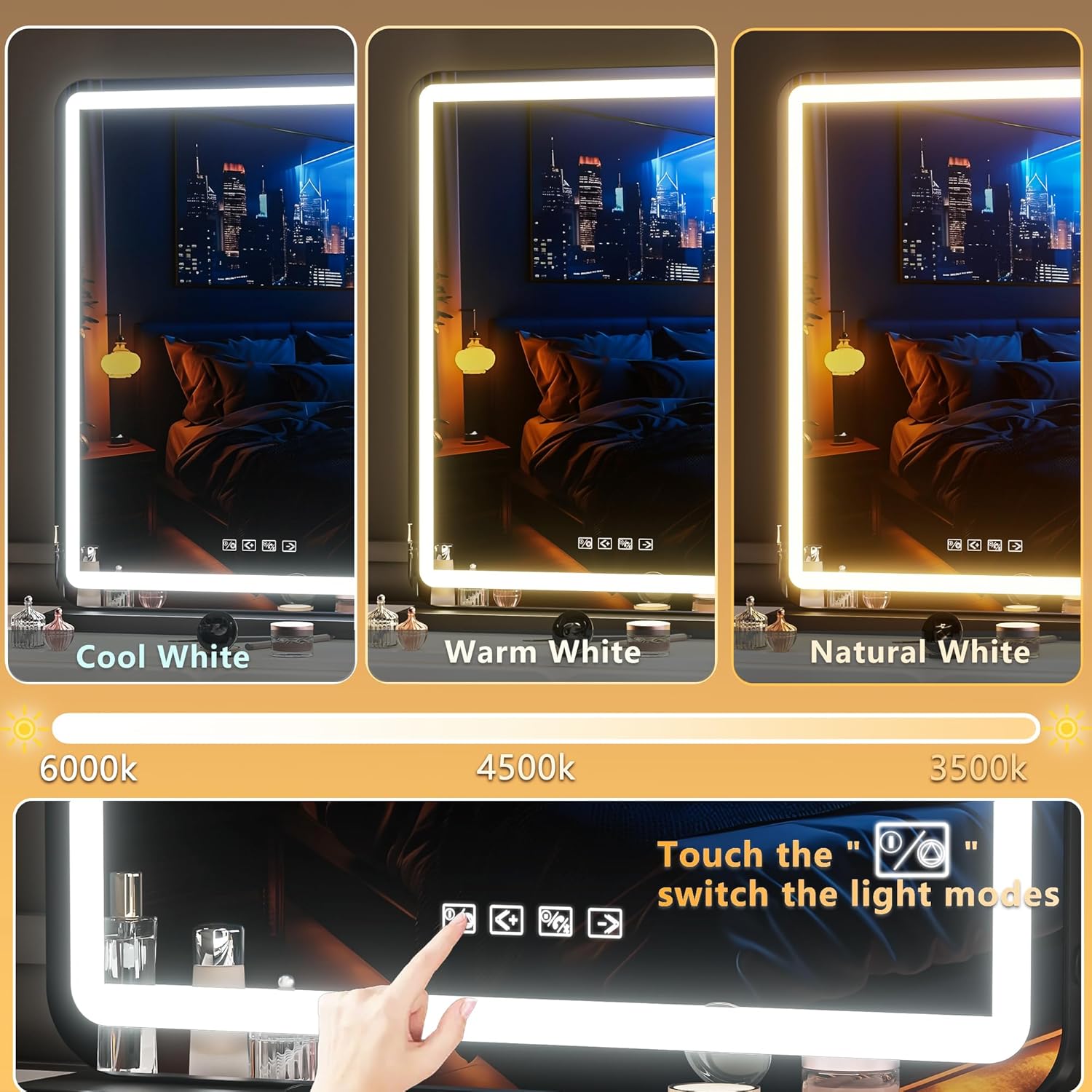 - đăSmart Touch Control & Memory FunctionăThis makeup mirror with lights has 3 smart touch buttons, turn on/off the light by touching the sensor switch, Press left button to change the color modes, long press right button to adjust the led brightness. This lighted makeup mirror is specially designed memory functionfunction keep your lights setting like your last use.