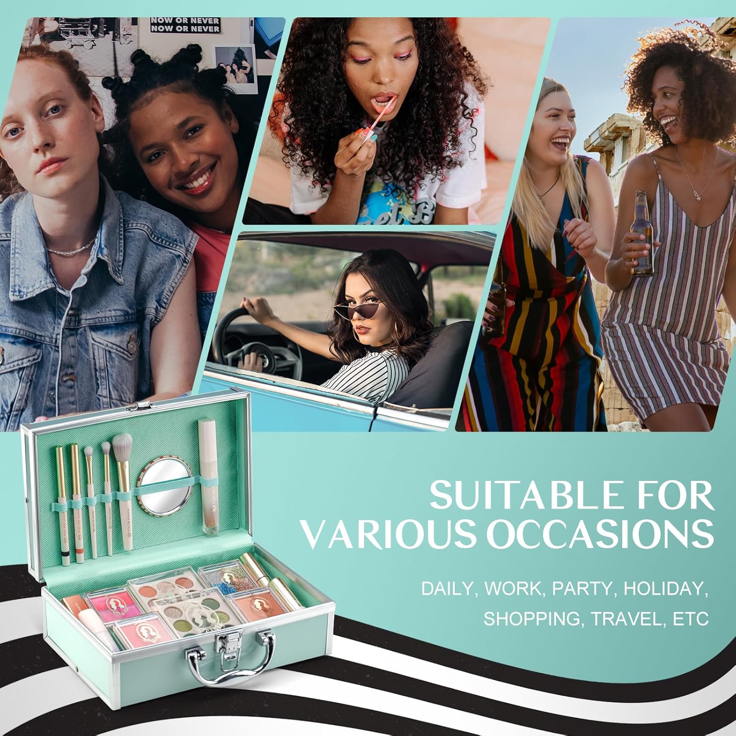 - Green Train Case Makeup Kit: Fresh and energetic style, Light makeup color and best for some outdoor activities,such as picnic,cycling and camping etc.