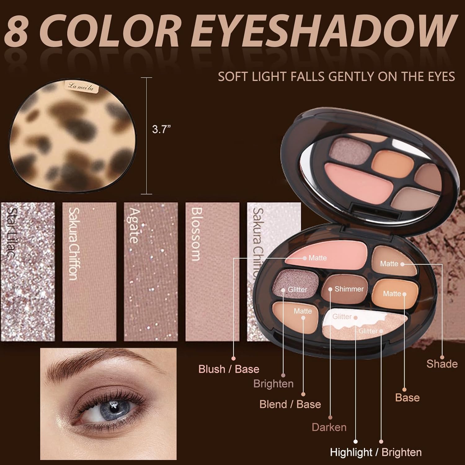 - đź’„ALL IN ONE MAKEUP KIT FOR GIRLS - 1 x 8 colors nature tone, multi-purpose eyeshadow palette, 1 x waterproof and smudge-shield mascara, 1 x waterproof and smooth liquid eyeliner(friendly to newers), 1 x eyebrow soap(set brows all day), 1 x mesh cosmetic bag(portable & easy to find makeup stuff), 1x double-head lip gloss, 1 x 7pcs Soft Makeup Brush Set. The simple make up set is perfect for makeup artists or starters & beginners achieving a full-face flawless, natural & nude eye makeup effect.