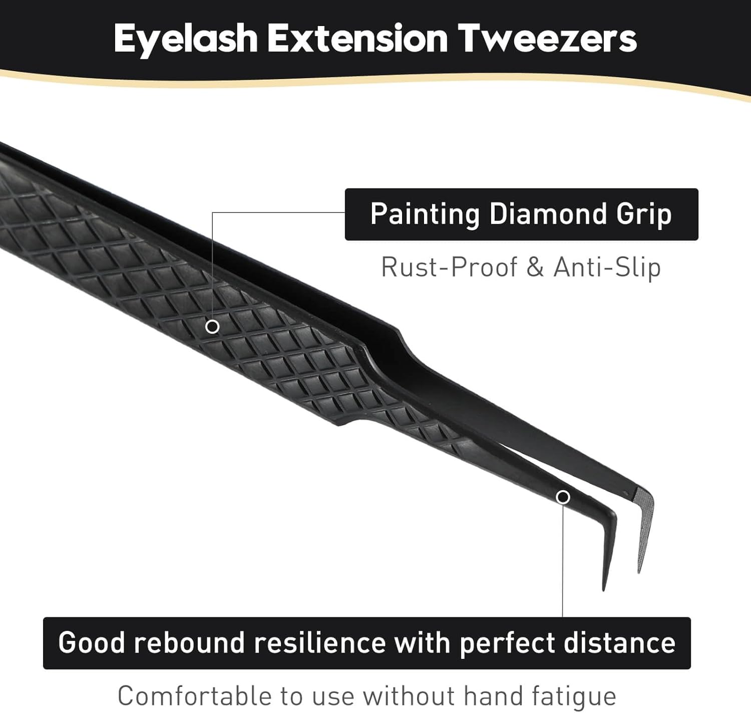 Ms.Queen Lash Tweezers for Eyelash Extensions, Diamond Grip 90 Degree Fiber Tip Volume Lash Extension Tweezers,Black