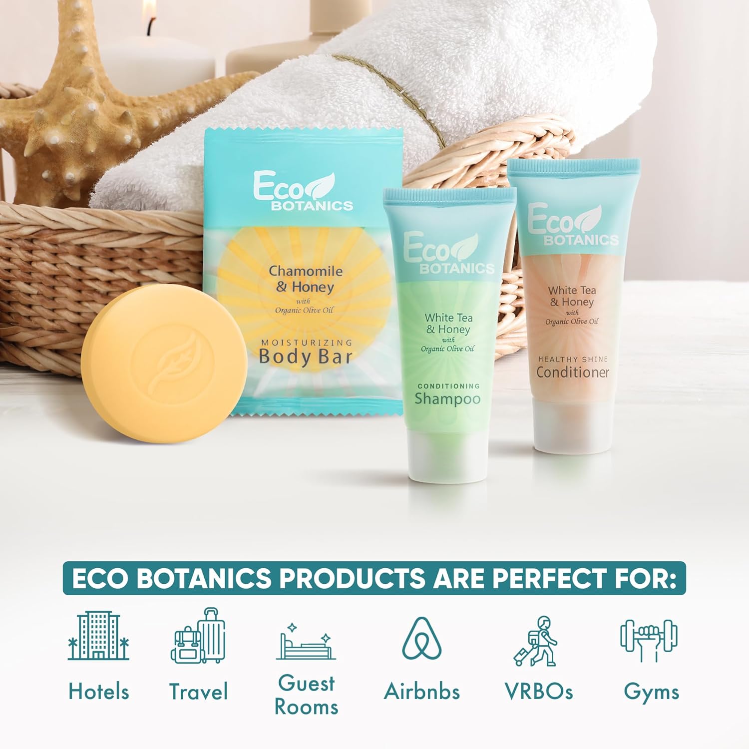 Eco Botanics Hotel Soaps and Toiletries Bulk Set | 1-Shoppe All-In-Kit Amenities for Hotels & Airbnb | 0.85 oz Hotel Shampoo & Conditioner, 0.89 oz Bar Soap Travel Size | 150 Pieces