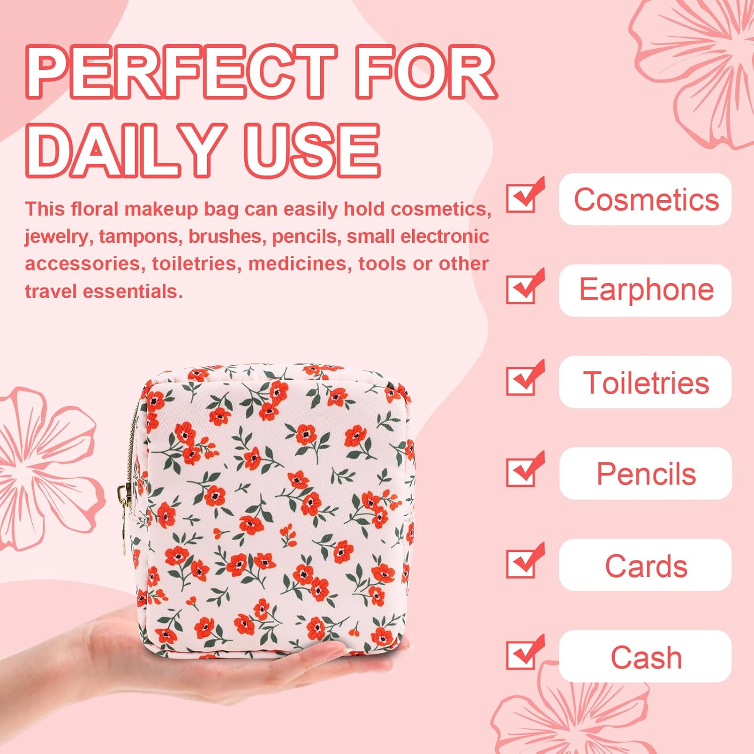 Waterproof Mini Floral Makeup Bag Pouch for Purse,Nylon Flower Cosmetic Travel Bag Small Preppy Toiletry Organizers Bag for Women Girl,Cute Zipper Pouch Coin Purse for Work(Mini Pink-Flowers)