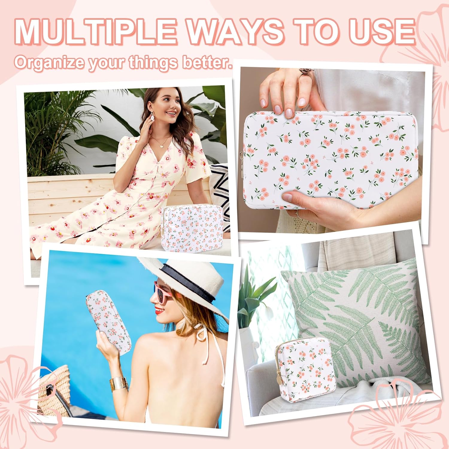 Waterproof Mini Floral Makeup Bag Pouch for Purse,Nylon Flower Cosmetic Travel Bag Small Preppy Toiletry Organizers Bag for Women Girl,Cute Zipper Pouch Coin Purse for Work(Mini White-Flowers)