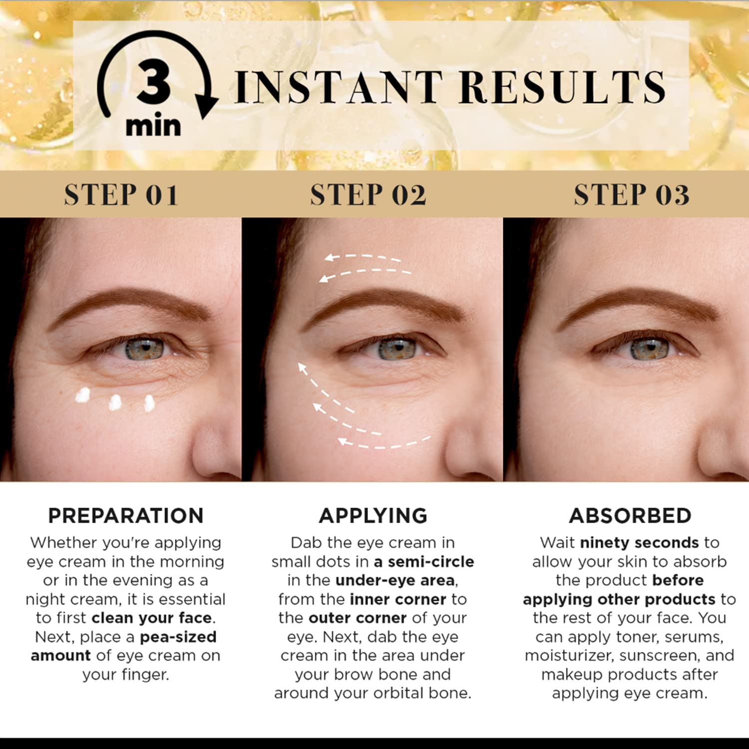 - đź’śTIPS FOR APPLICATION: 1>Using a pea-size amount of the eye tighener cream, spread a thin layer onto eye area, don't apply any more than the recommended amount. 2>Please keep your face clean and dry before use. Anti aging eye cream should be applied before daytime moisturizer and sunscreen. If any white residue is noticed after applying the eye cream, it is advised to moisten a cotton swab or fingertip and gently pat the edges to remove the excess.