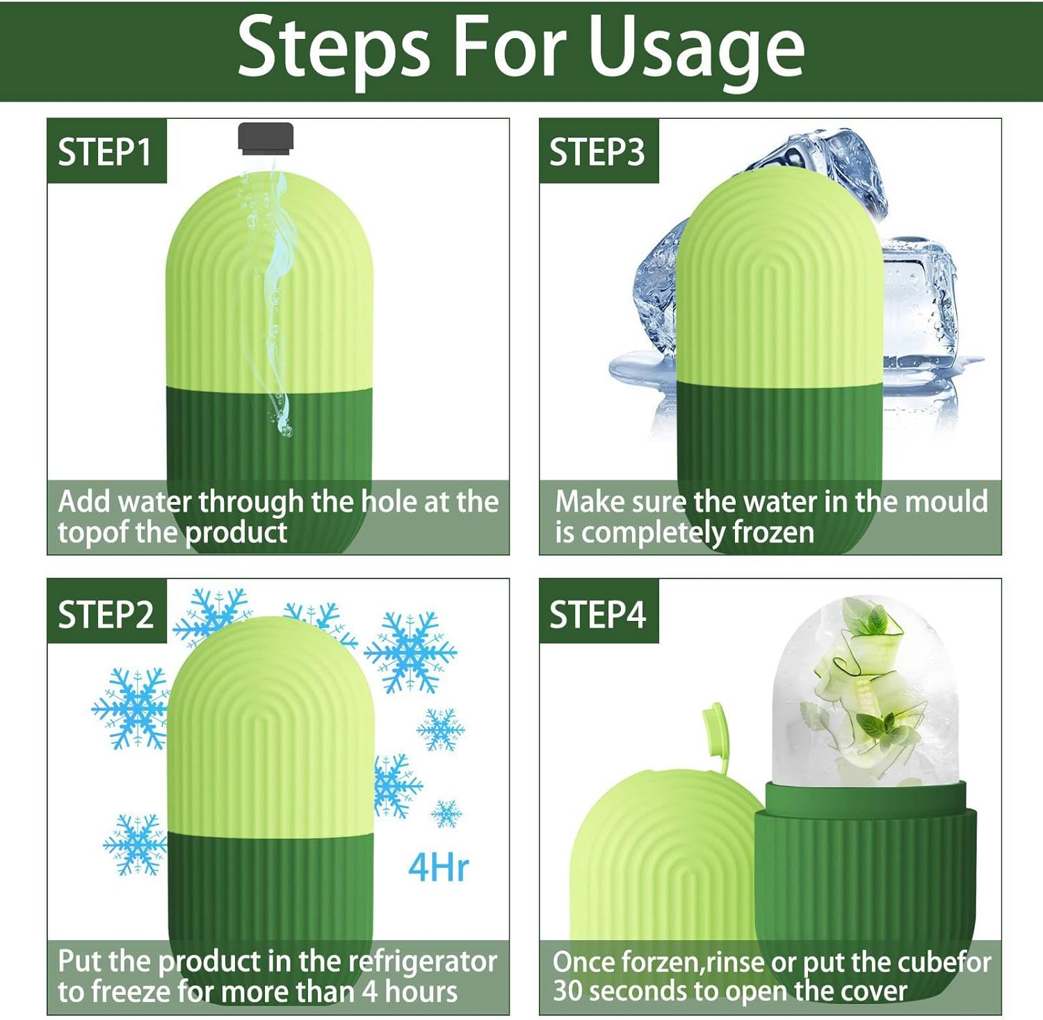 - đăEasy to useă EASY TO USE: Fill the ice roller massager mold with water. Freeze in refrigerator for more than 4 hours,when using it apply the ice to your skin in 30 second intervals in circular motions. For optimal results, It is recommended to use 1 or 2 times a day