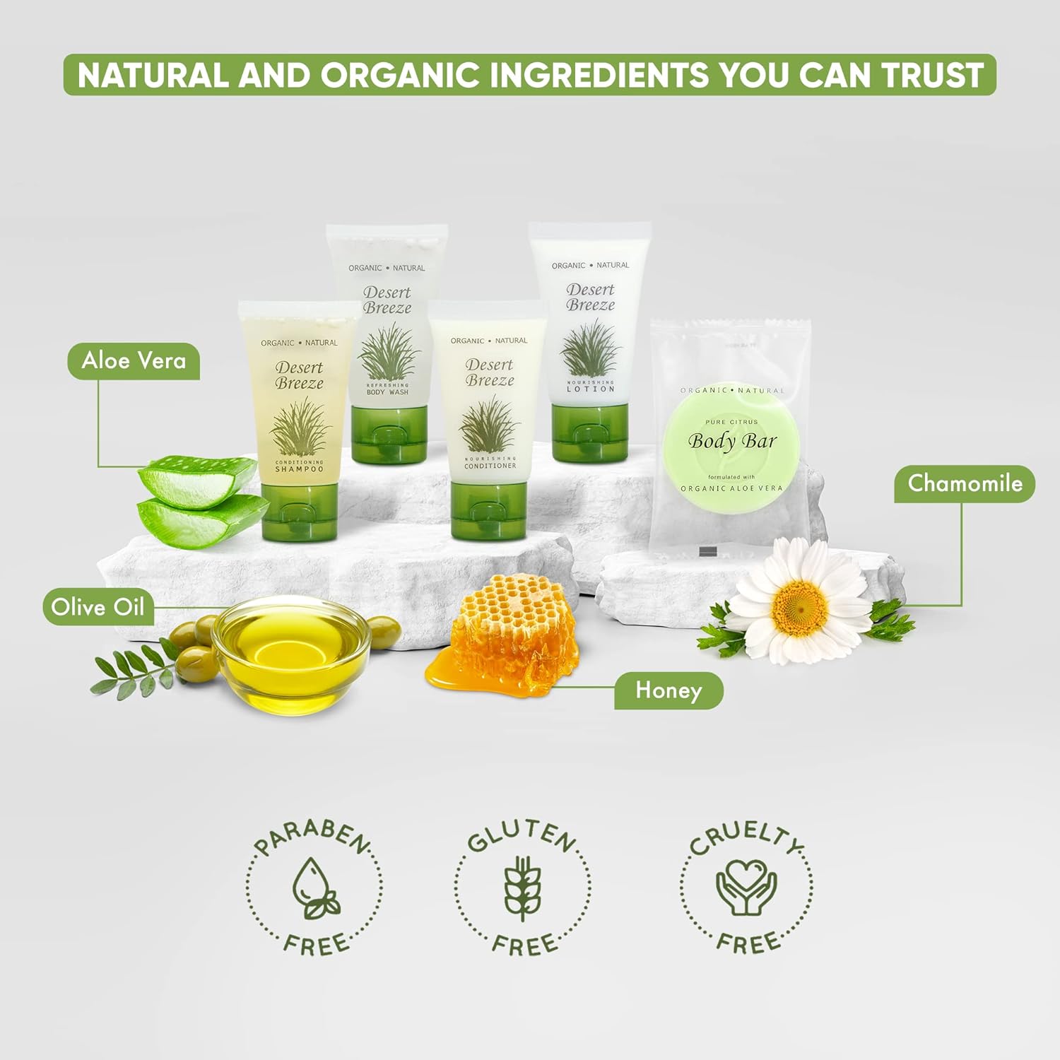 - WHY CHOOSE DESSERT BREEZE? Our high-end formula & environmentally-friendly beautiful design bring elegance to any upscale property. These hotel toiletries are paraben-free, gluten-free & made with organic aloe, honey, chamomile & olive oil for soft skin & hair!
