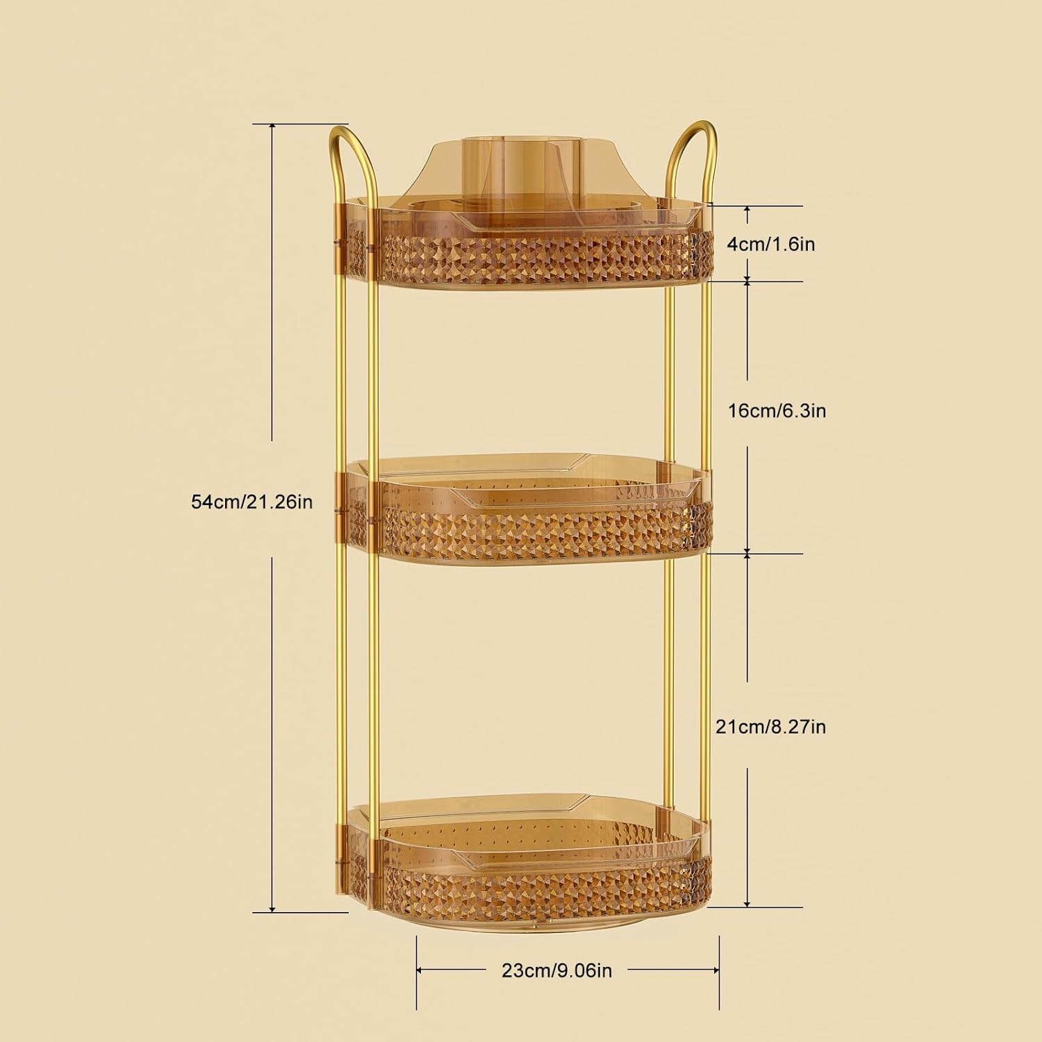 - Premium Quality Materials: The cosmetics organizer is composed of high-quality acrylic trays and sturdy metal brackets, which are stable enough. The edge details of the tray have been raised to prevent items from falling off during rotation