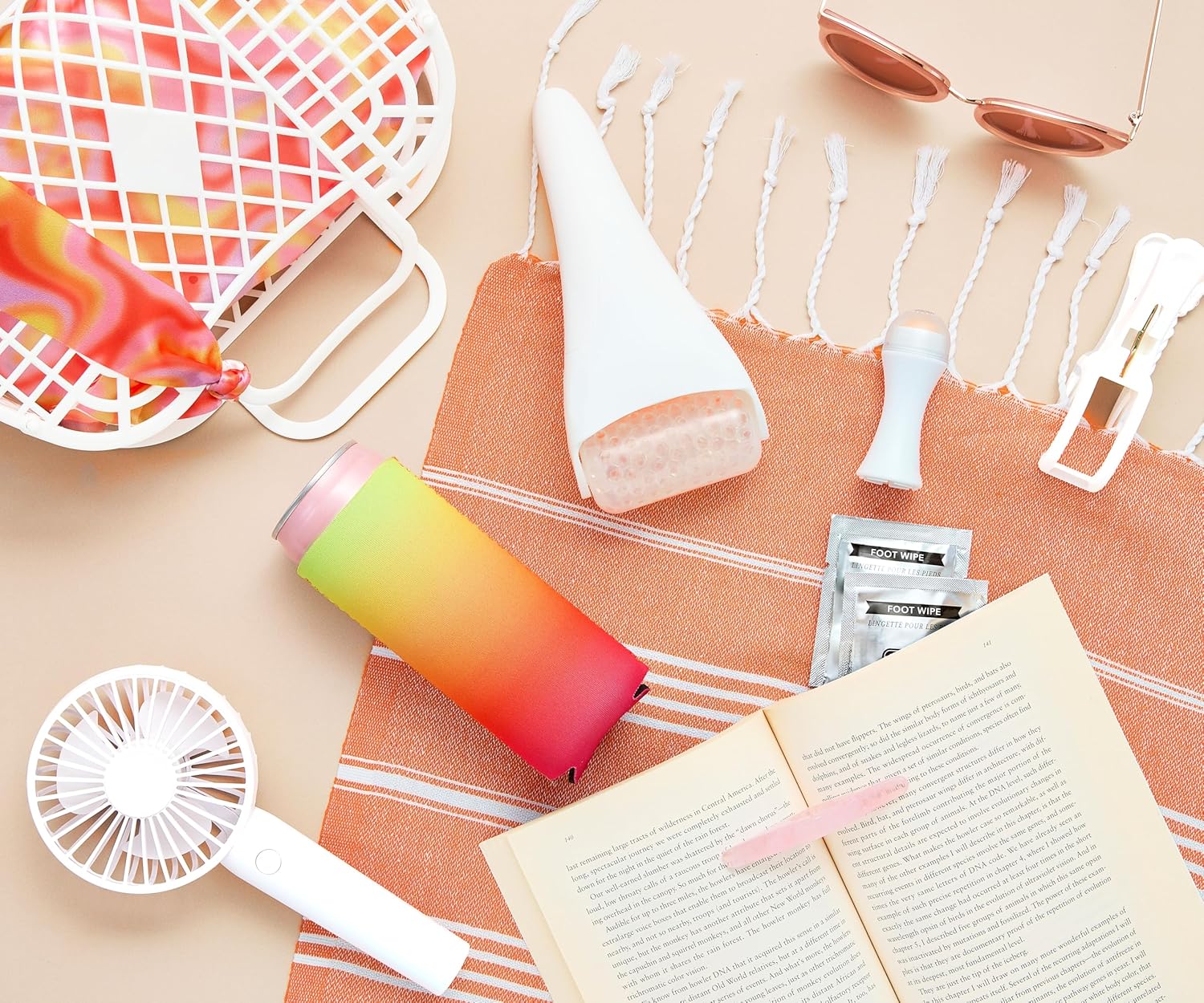 - BEACH & VACATION ESSENTIALS – Our 10 essentials & accessories will be sure to leave you feeling chic, trendy and cool. Every item was hand-picked for your convenience! It includes 2 towel clips, thumb-page holder for reading, floatie repair patches, 2 foot wipes, a mini rechargeable fan, oil-absorbing roller, ice roller, a slim can cooler & a scrunchie