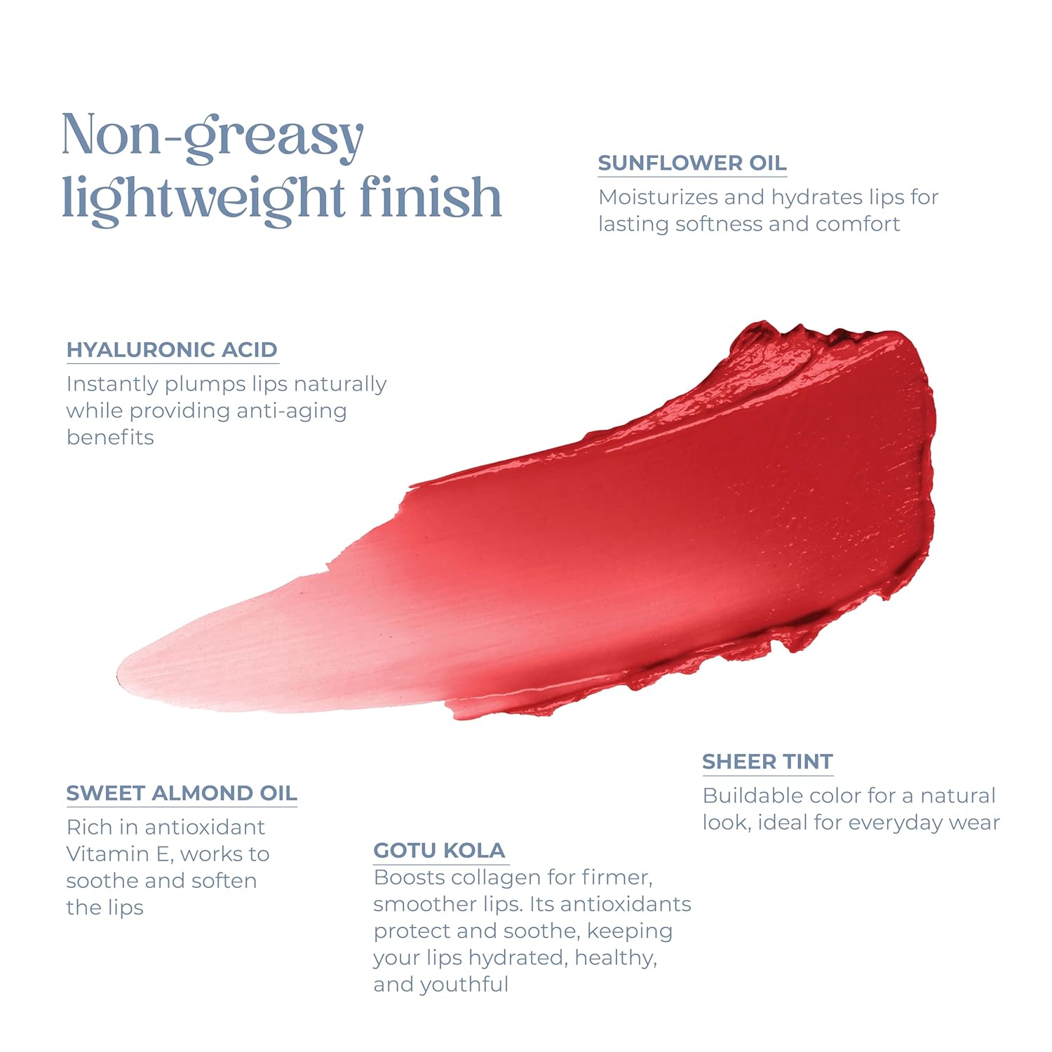- Comfort: Formulated to be lightweight and non-sticky, providing a comfortable feel on the lips. Convenience: 2 in 1 formula. Combines the benefits of a lip balm and a lip color in one product, making it easy to carry and use on the go.
