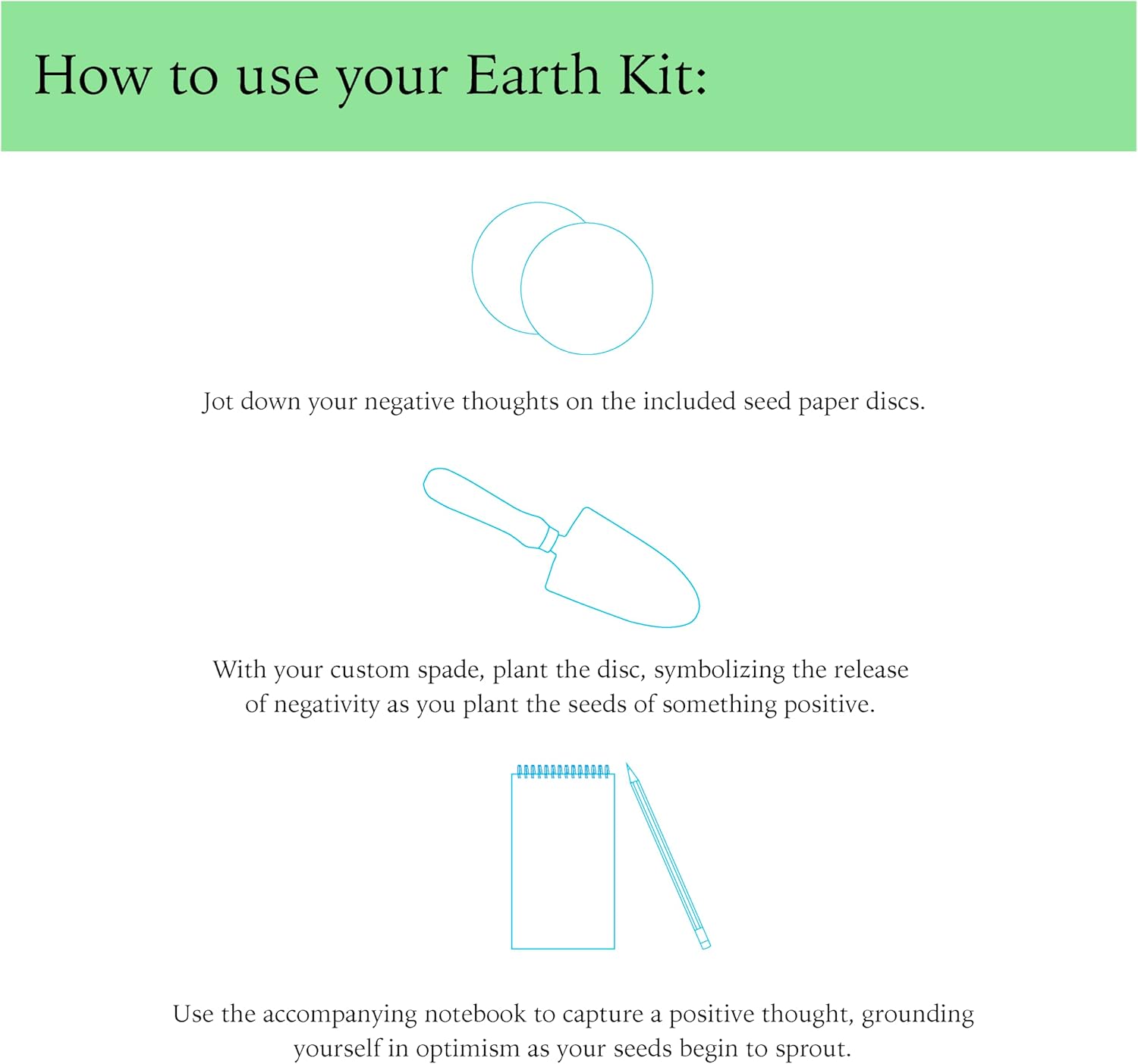 - Bloom and Blossom - This self care box has the products you need for a transformative journey. Write your negative thought on the seed paper disks, then use the custom shovel to plant the disks. Water them and take care of them - the way you would nurture the kindness, generosity, and care within you - you'll see your negativity transform intosomething beautiful. Use the journal to ground your positive thoughts.