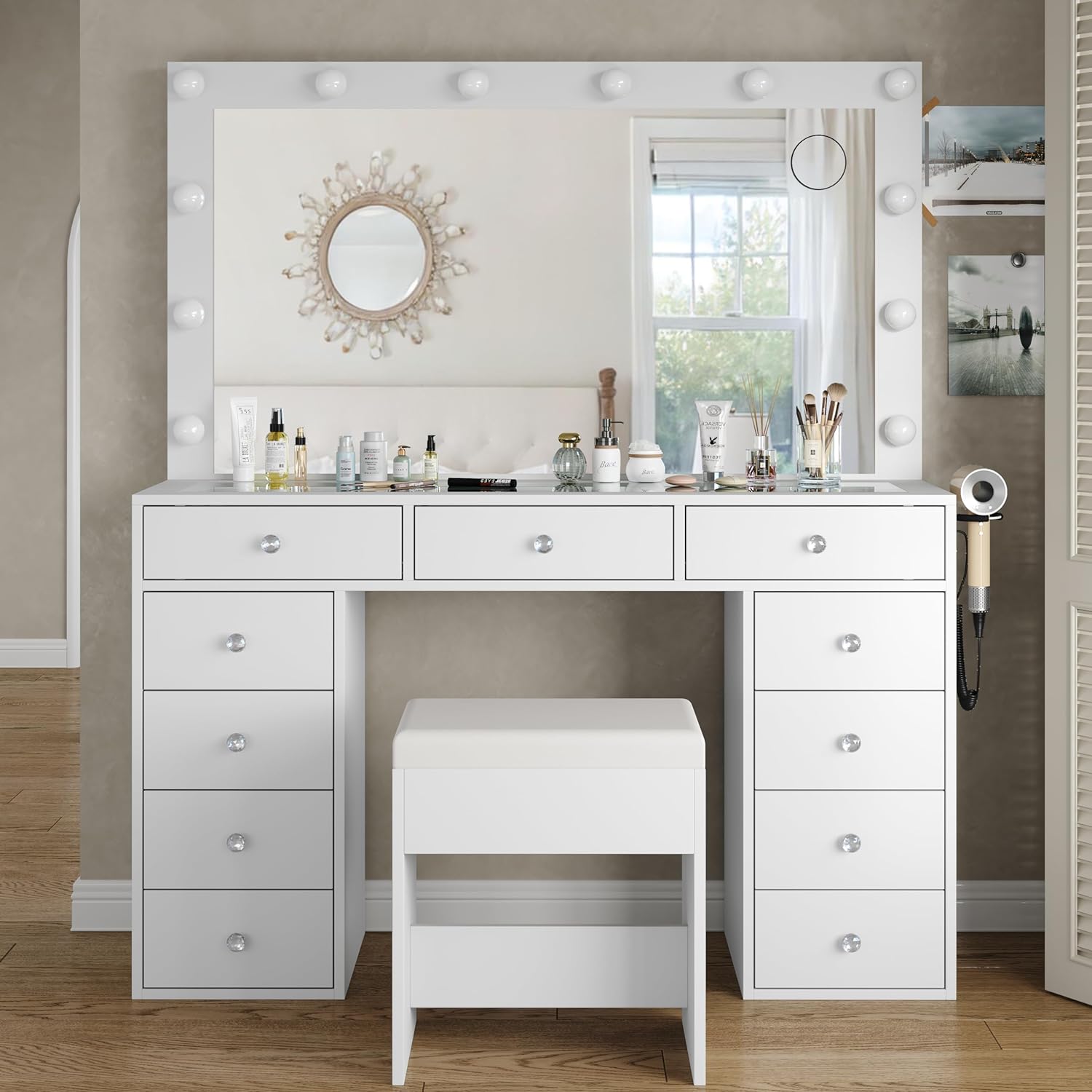 Vanity Desk & Power Outl, Makeup Vanity with Mirror and 12 LED Lights, Makeup Table with 11 Drawers, Vanity Table with Chair,Set 3 Lighting Modes Brightness Adjustable-(White)