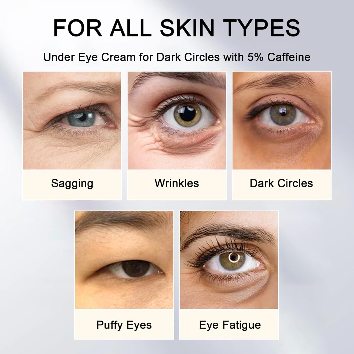 - 【5% Caffeine Eye Cream】5% Caffeine eye cream for dark circles and puffiness is perfect for making sure your eyes look awake, even if you are running on a few hours of sleep. This eye cream is specifically designed for under-eye puffiness, dark circles, and wrinkles, making the skin beneath the eyes look smooth and refreshing