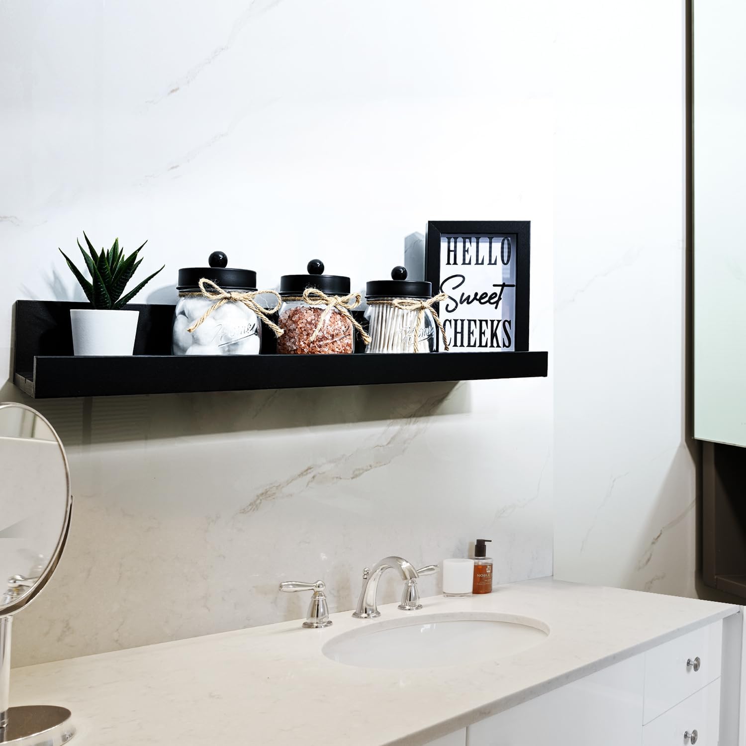 - šElegant and Cute Bathroom Decor: Add charm to your bathroom with this glass bathroom mason jars set! Perfect accent to bathroom shelving, bathroom countertop, makeup vanity, carft room, black and white accented bathroom, and guest bathroom. Ideal for home decor, this collection embodies a variety of styles including rustic, western, farmhouse, and contemporary designs. It is particularly well-suited for bathroom decor and offers a versatile aesthetic that complements both traditional and modern interiors.