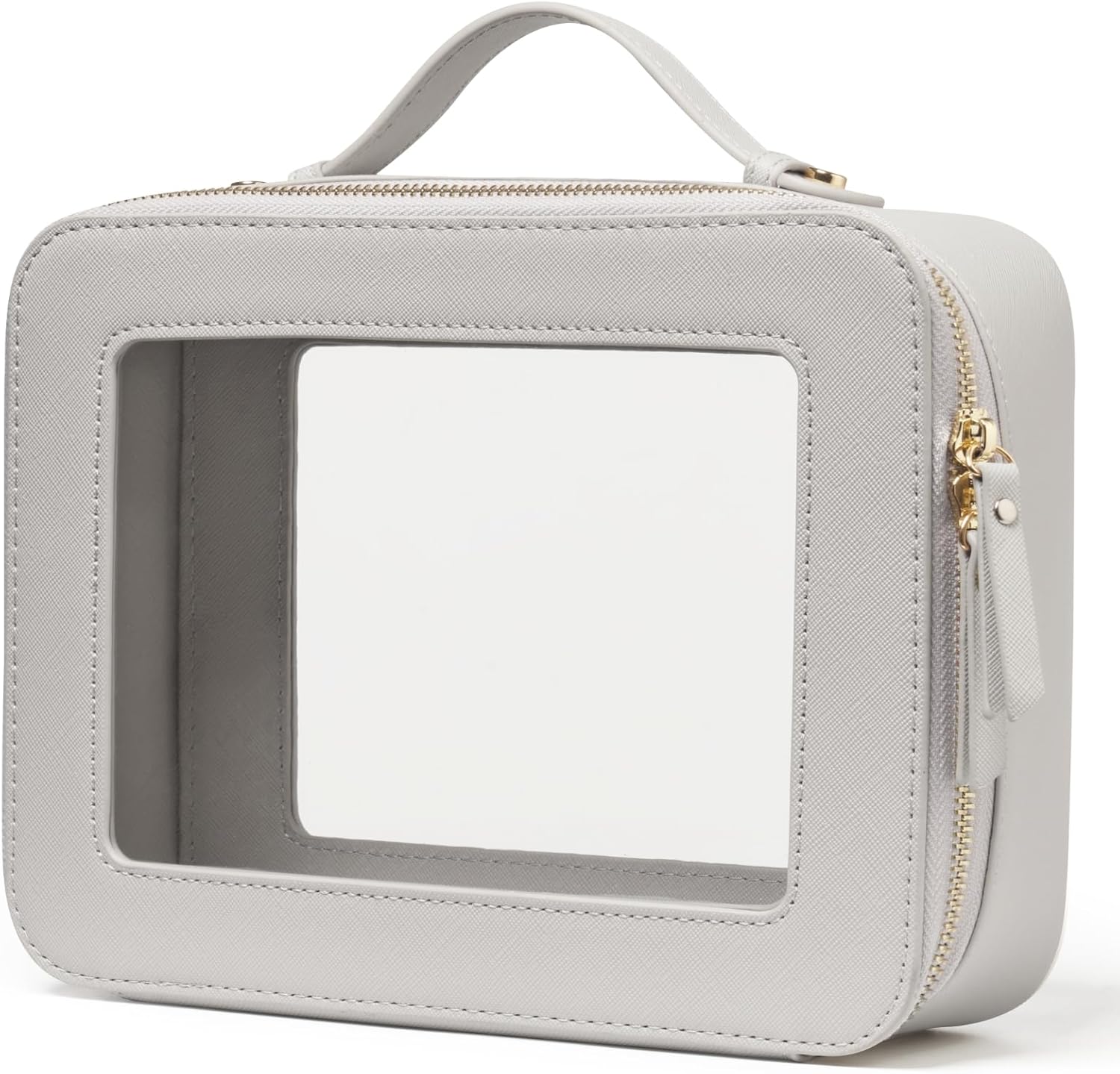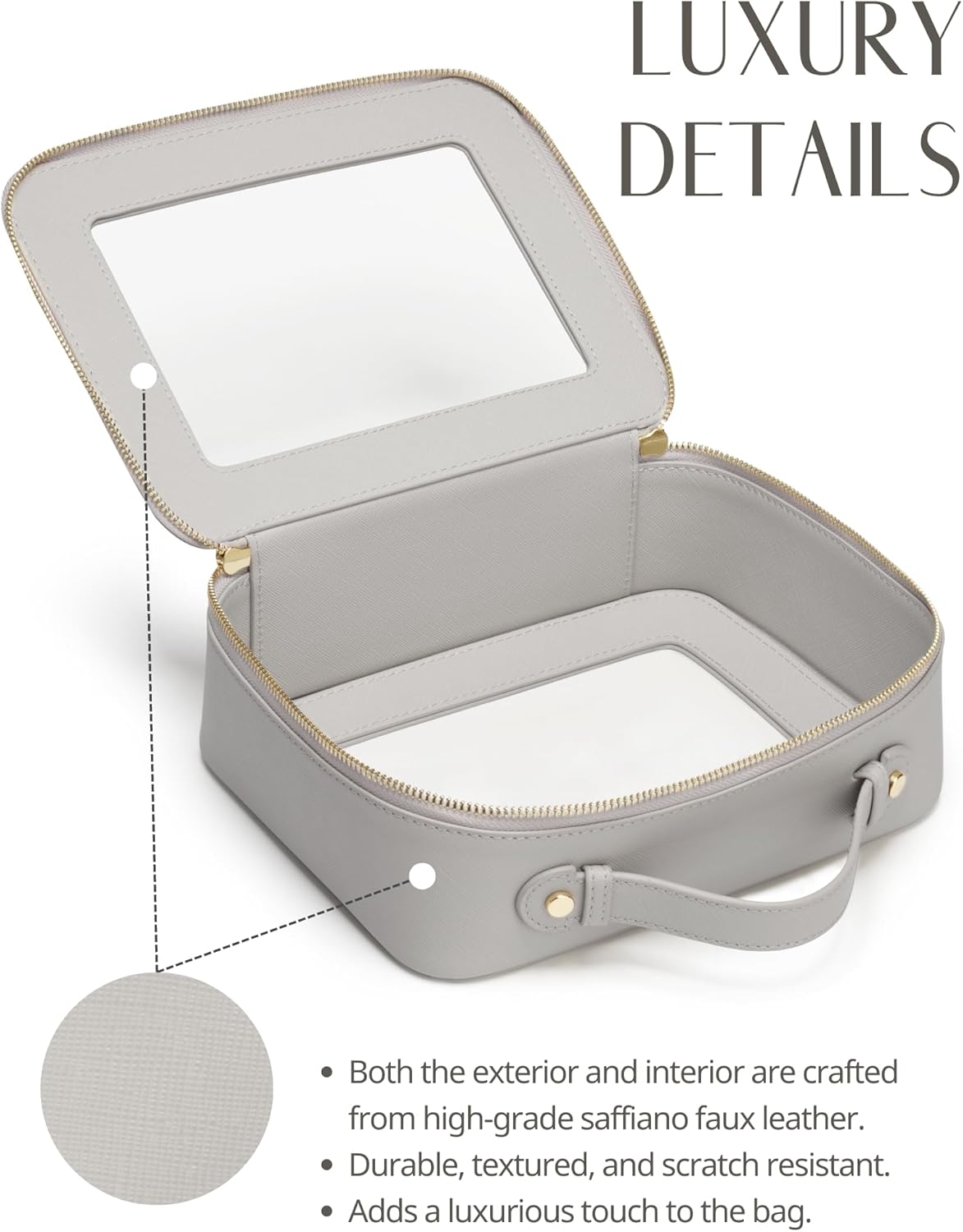 - [Premium Quality] - This clear small cosmetic case is crafted from high-grade saffiano faux leather, making it highly scratch-resistant, durable, and easy to clean. It features a smooth zipper for secure closure and elegant light gold metal accents for a luxurious touch.