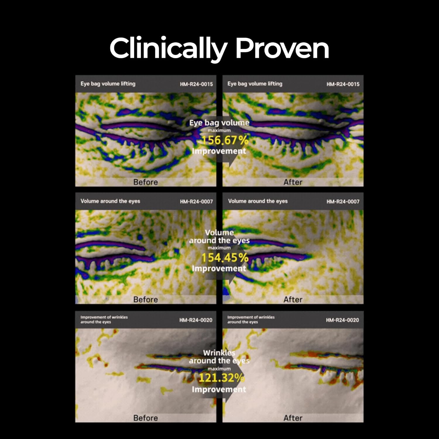 - CLINICAL RESULTS : Up to 156.67% Eye Bag Volume Enhancement, Up to 154.45% Eye Rim Volume Enhancement, Up to 121.32% Wrinkle Improvement.