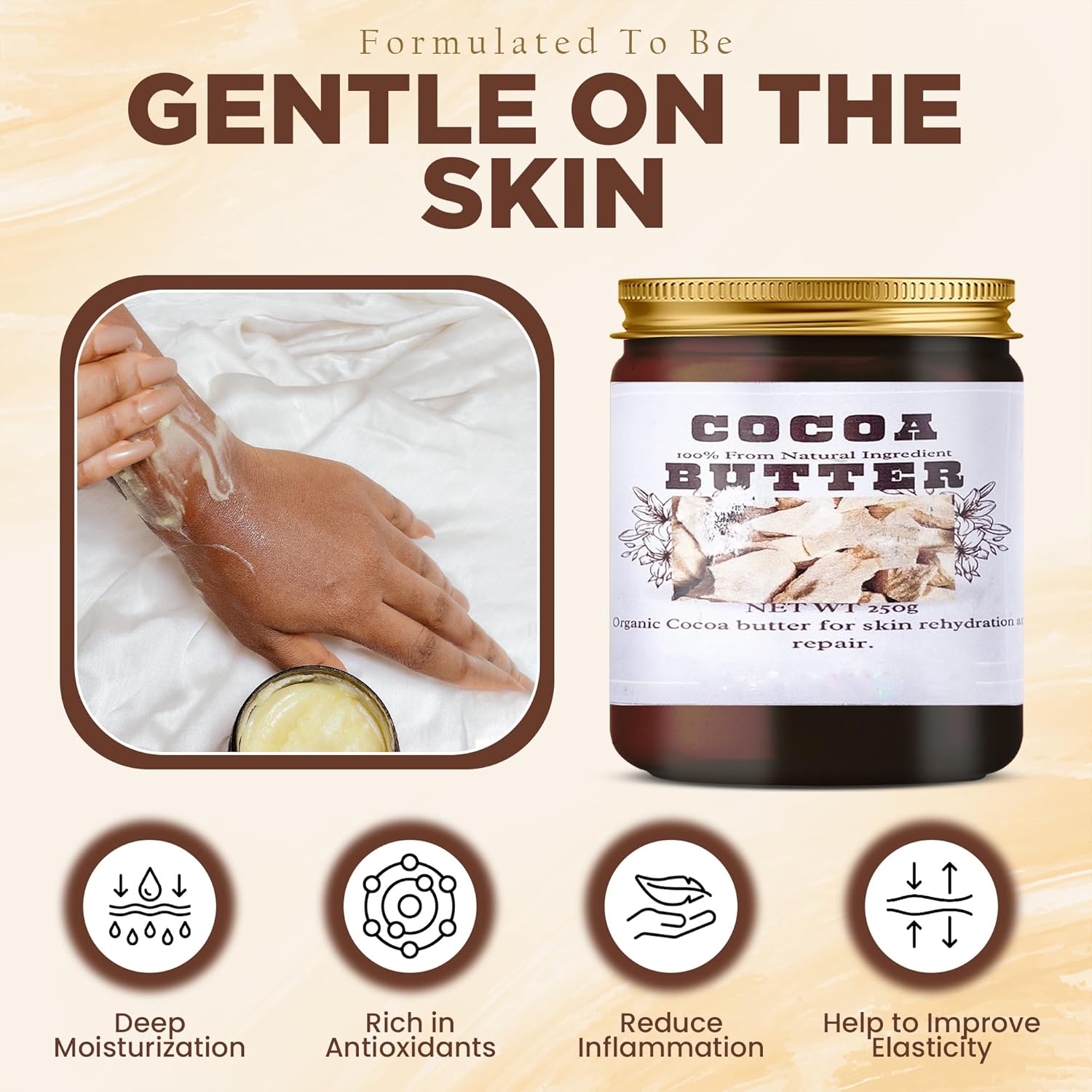 - Skin Benefits: Cocoa butter cream contains antioxidants and fatty acids that improve elasticity, reduce inflammation, and soothe irritation. Protect your skin from environmental damage.