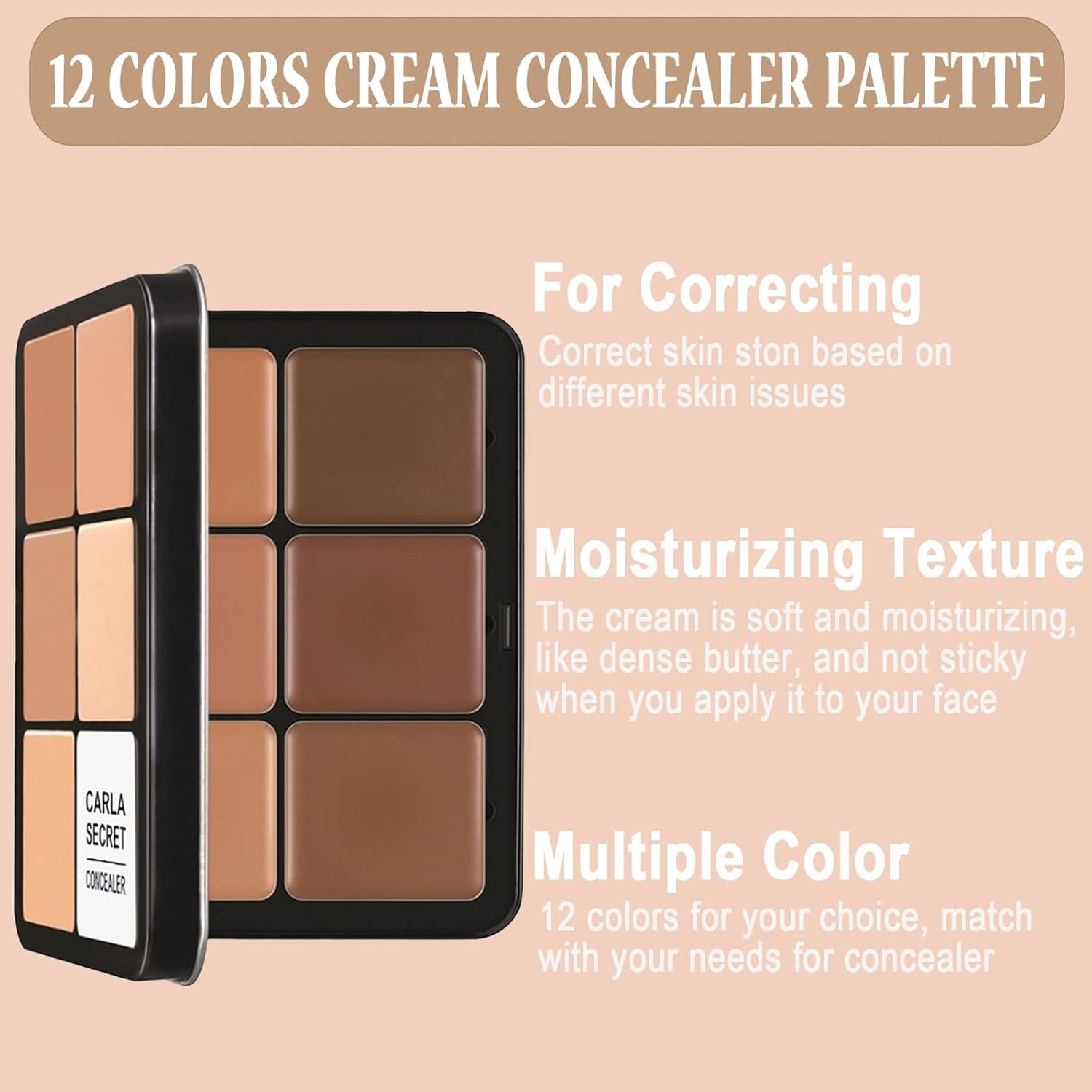 Cream Concealer Contour Palette, 12 Colors Foundation Palette Cream Makeup Palette with 11 Pcs Makeup Brush Set, Long Wearing Blendable Full Coverage