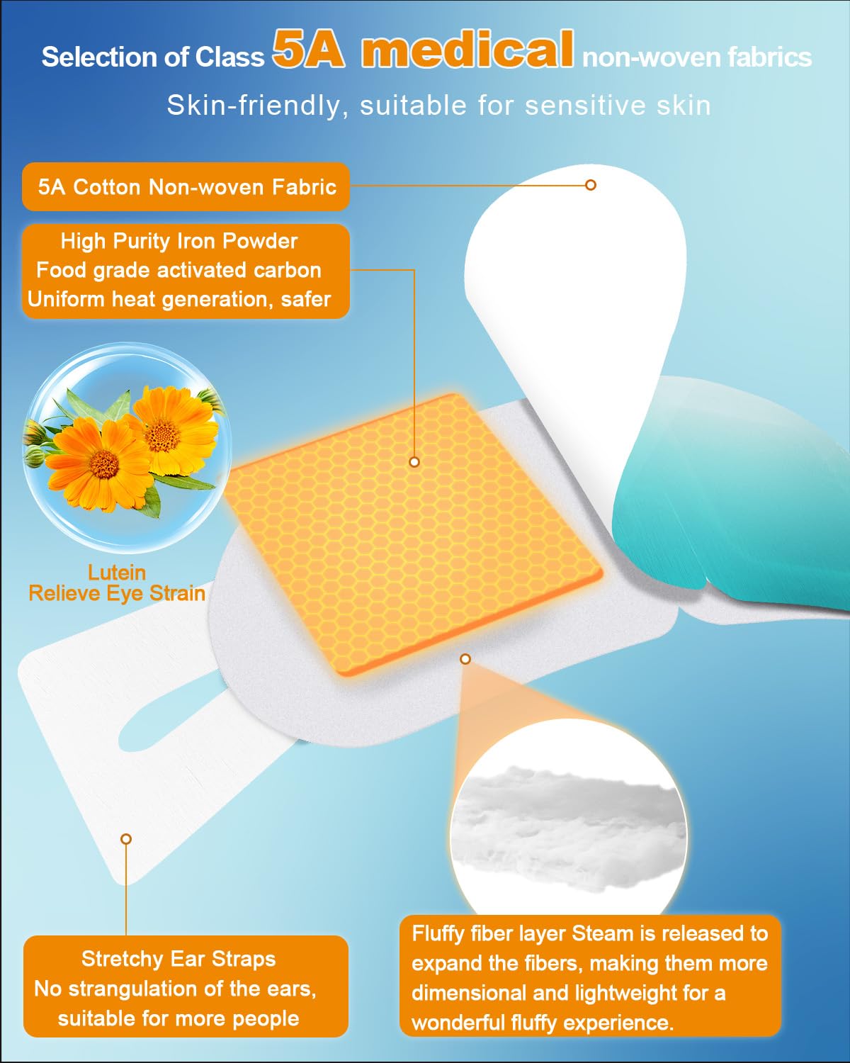 - ✔WARM AND RELAXING- The temperature of the Disposable Steam Eye mask Only 104℉-113℉. it ‘s just higher than the human body’s temperature in a little bit. so you will feel warm but not hot. This temperature lets you relax to sleep easily.